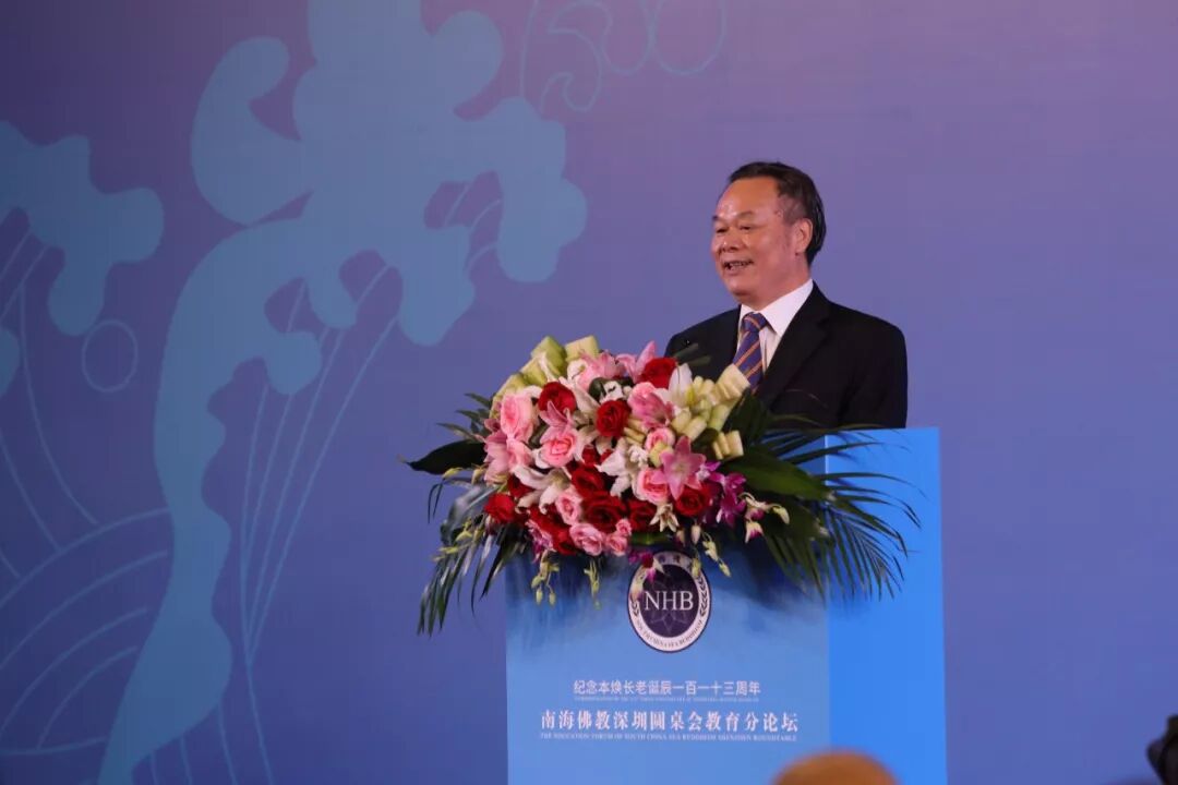 深圳市委统战部副部长、市民宗局局长王子建发言,他说随着伟大祖国的日益复兴,中国佛教和中国佛教教育也呈现出繁荣的局面,本焕学院保持了师资高水准,也保证了毕业生的品质,为中国当代佛学院建设提供了许多宝贵经验。并说到佛教的兴盛不仅在于教理的探索,也在于佛教人才的培养,要不断的探索与完善培养佛教人才的理念、模式和方法。