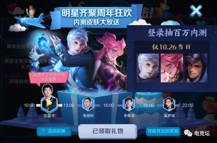 第八个活动就是明星送祝福活动了,应该是像去年一样,当天会有五个整点:10点、13点、16点、19点、22点。每个整点会派送百万内测皮肤孙尚香蔷薇恋人、嬴政优雅恋人,今年还增加了一款高渐离的玩趣恶龙限定皮肤,因此机会可能会更大哦,就看看谁的运气更好啦。