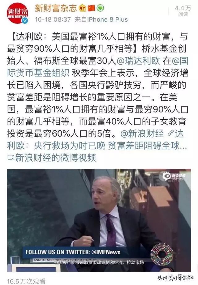 就在今天,桥水基金创始人、福布斯全球最富30人达利欧的讲话,他说美国最富裕1%人口拥有的财富,与最贫穷90%人口的财富几乎相等。