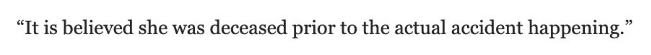 截至上午9.50,法医人员正在努力将她的尸体从汽车上移走。他们不得不拆除汽车的两个门,灵车已经到达现场。