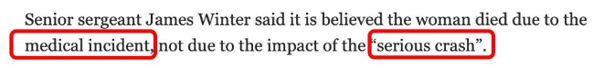警方表示,这名妇女之所以死亡是因为医疗事故,而不是由于“严重撞击”影响。