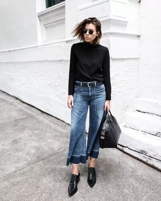 黑色小高领+牛仔裤,最最基础的穿搭look,黑色是最酷的颜色,微微高耸的领子让气场更强,想酷一点就来试试吧。