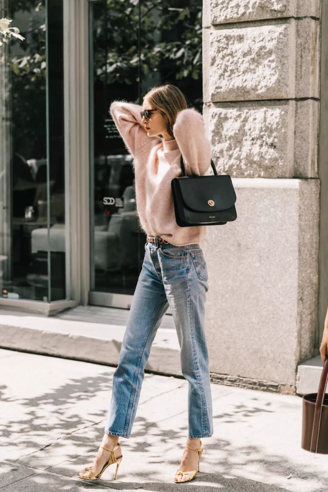 藕粉色小高领毛衣+mom裤,太温柔太气质,btw妈妈裤真的不挑腿型哦。
