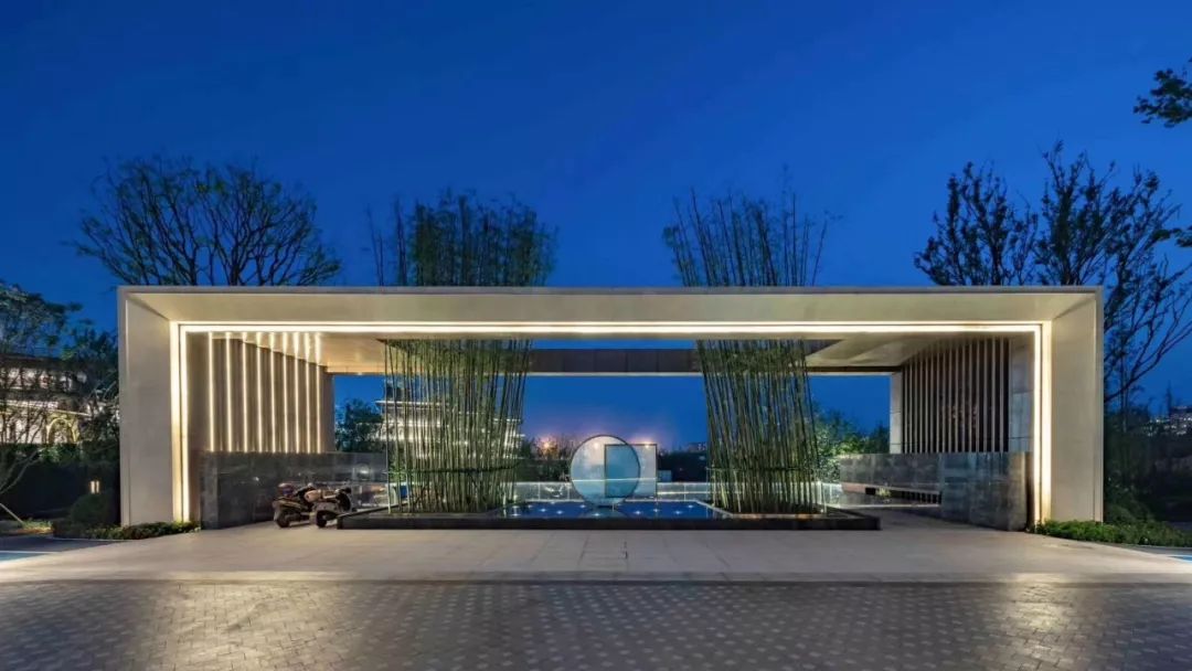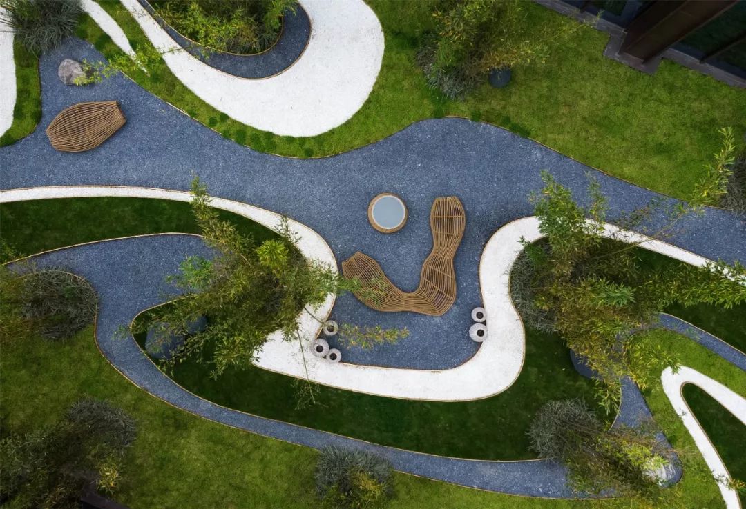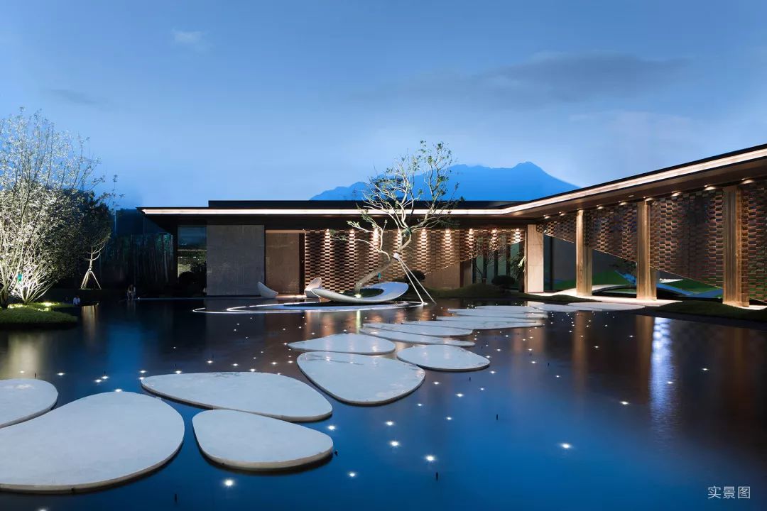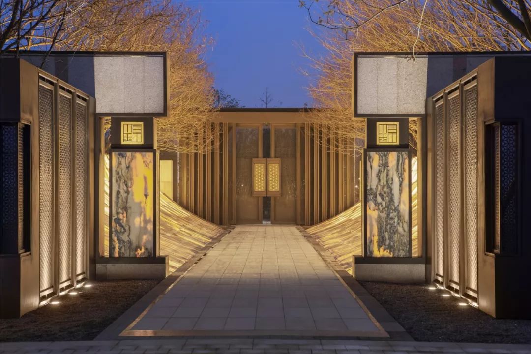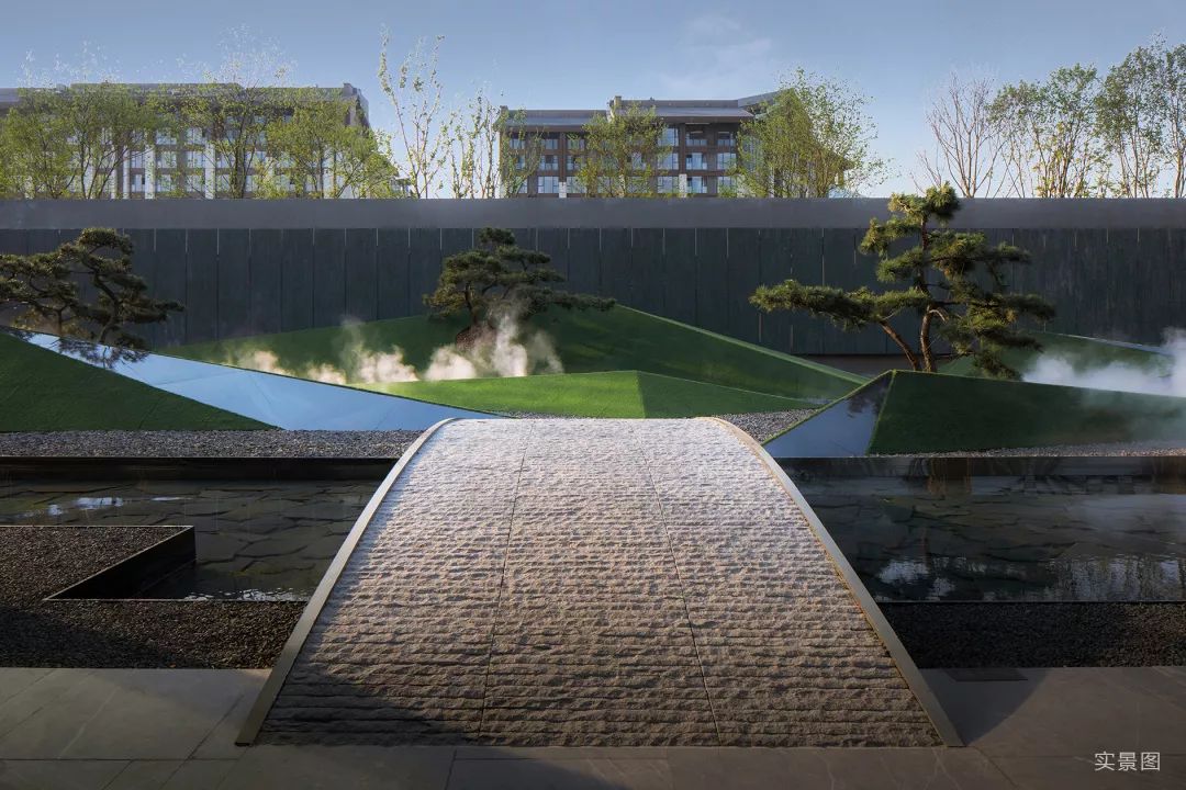 设计从当地禅道文化出发,以“循道天然”的文化理念为根,朴雅自然的设计风格为道,打造“五间十景”的四进景观格局:一重山门、二重中门、三重园门、临湖而居。入口设计灵感来源于川西地区的峡谷与山涧,气势恢宏,山石林立、悬瀑如虹,仿若一个秘境的入口,为我们打开一个充满惊喜的世外桃源之旅。