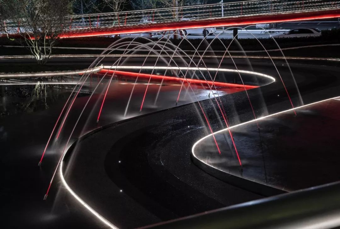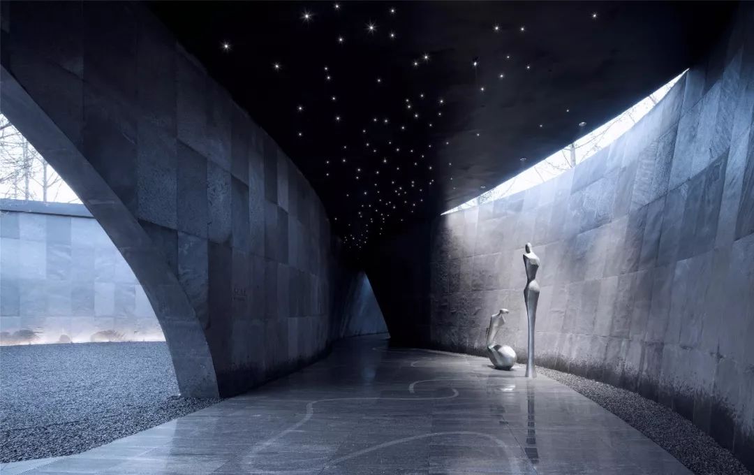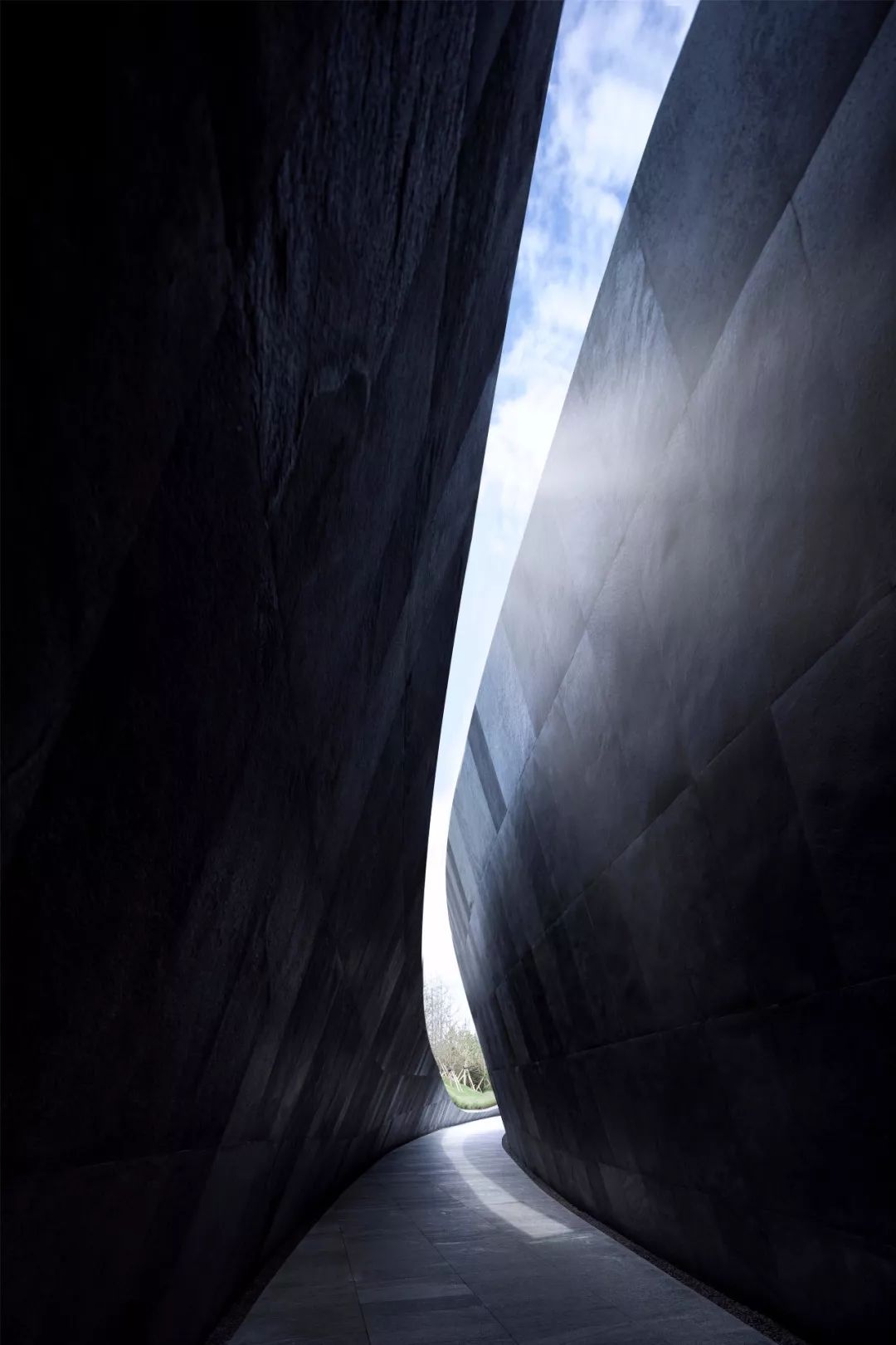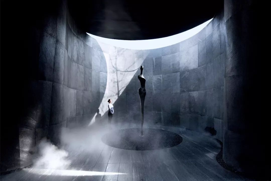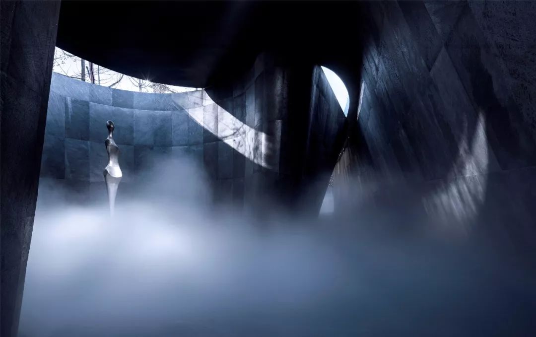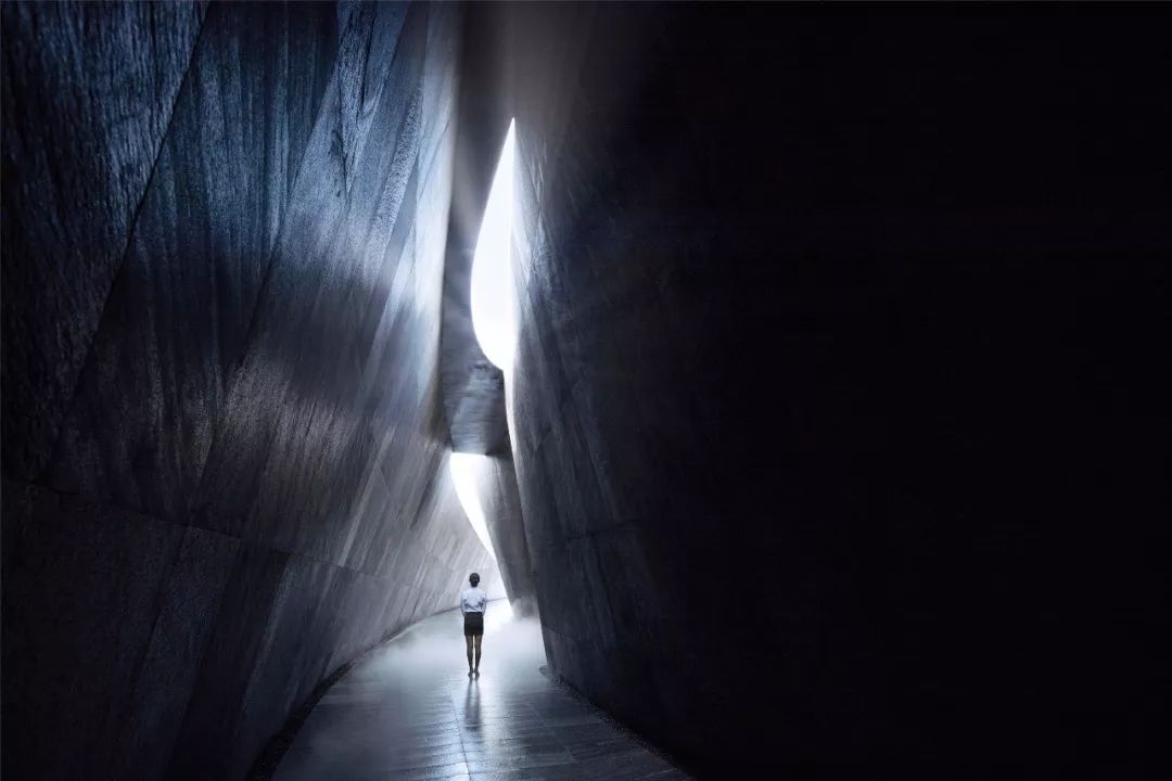 设计意图打造一个全新的空间,创造一种全新的体验,形成项目自身的独特性、识别性和美学价值。设计用“全新的材料和技术,以及最现代的抽象语言”所编织出光之峡谷。光束从黑暗中穿透而来,在这两片黑色的流动的墙体的迂回转折处,便有了这一小段如“真空般”的黑暗,让人置身其中瞬间感觉与外隔绝。