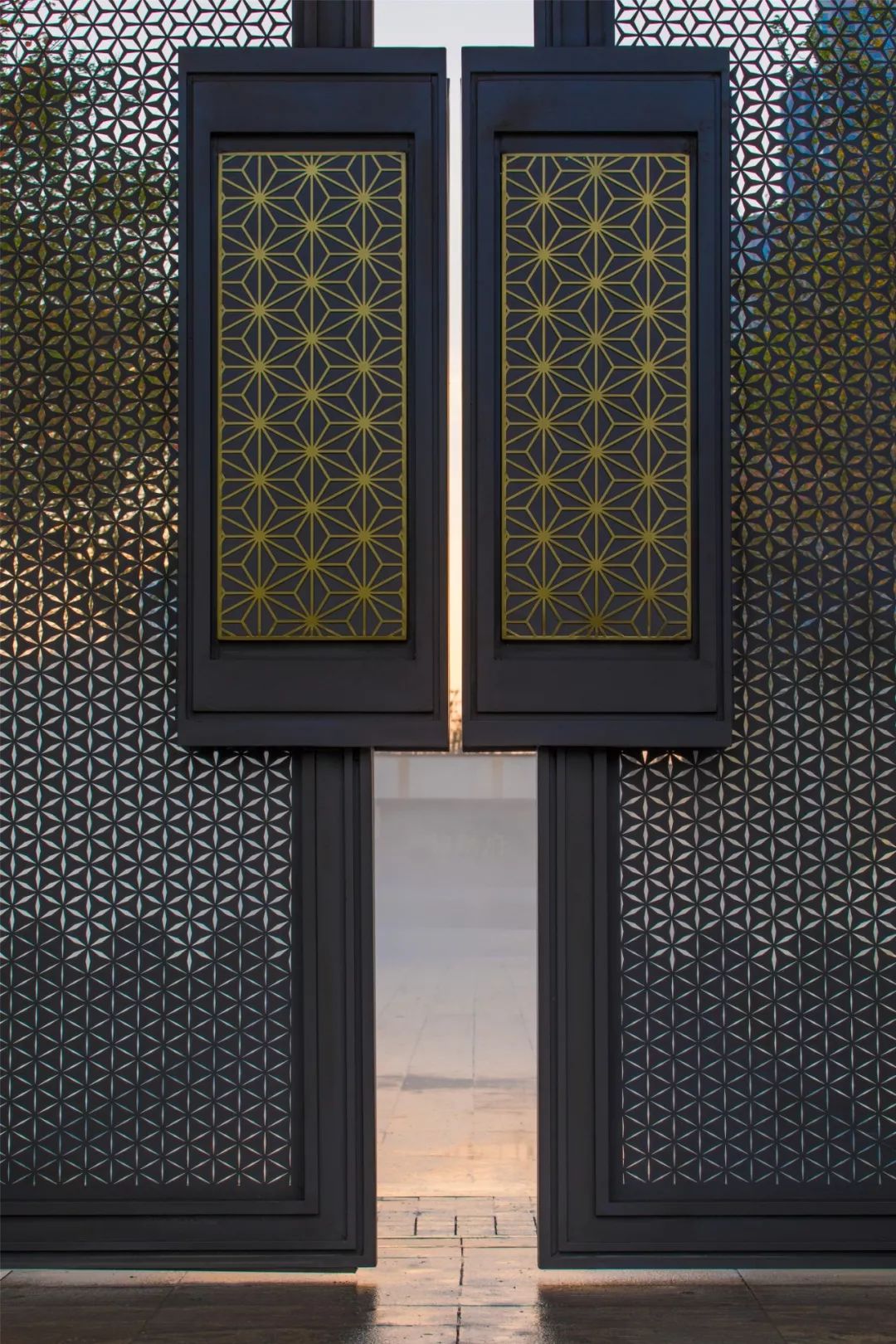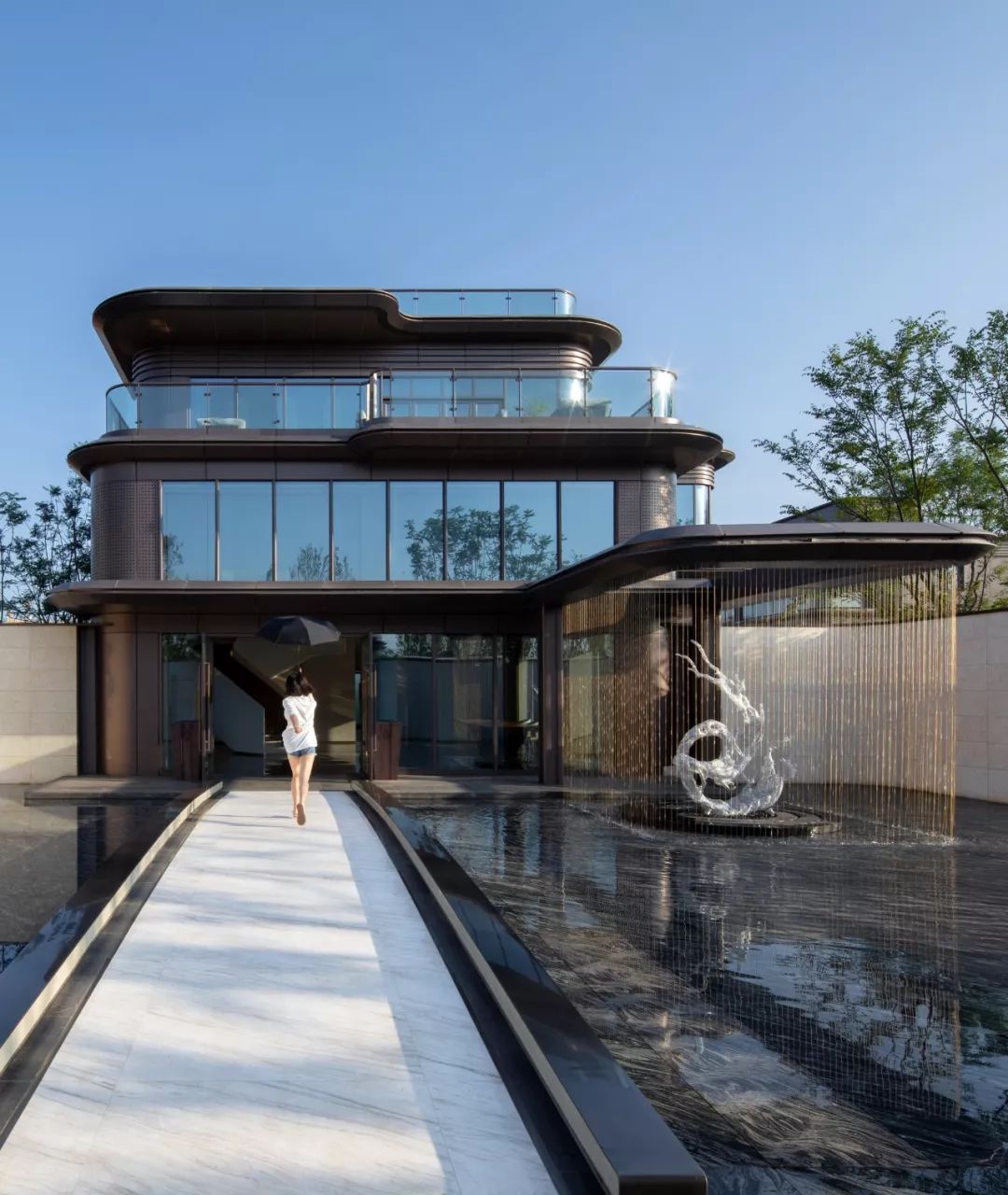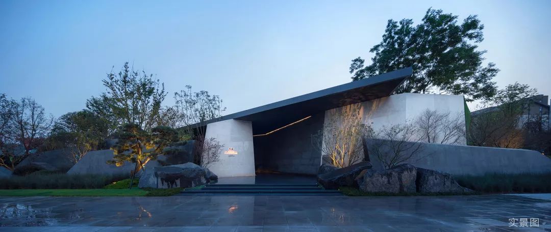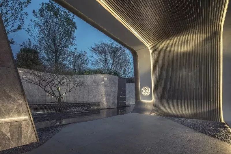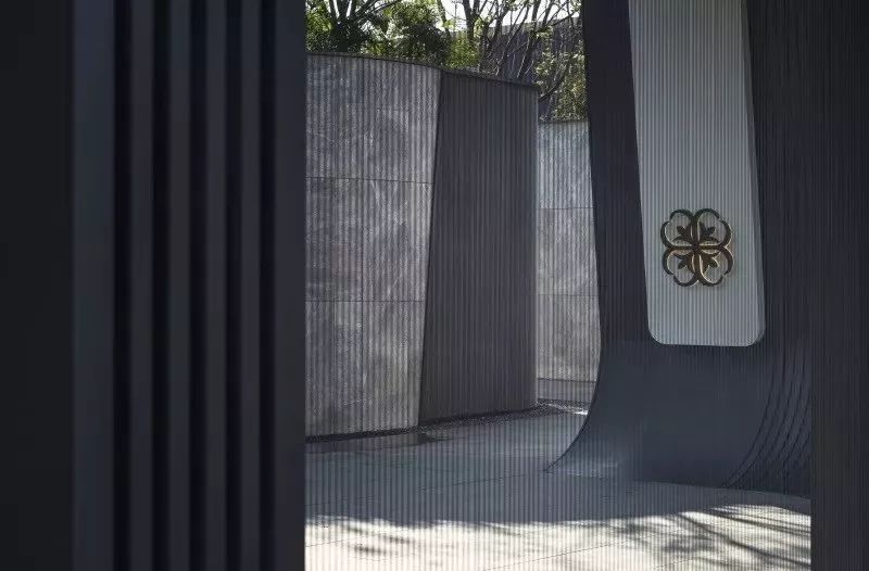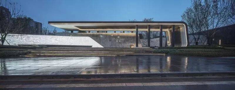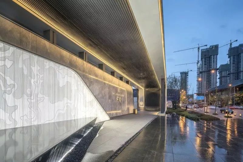 成都融创文旅城·生活体验馆坐落于都江堰市玉堂镇赵公山脚下,借由道家思想,从自然中体悟。以山为灵感,四座高低错落的异形景墙巍然矗立在入口两侧,舒展流畅具有引导性。倾斜的屋顶与深邃的长廊相依,形成低调隐奢的入口,逐渐凝聚视线,让人忍不住想一探究竟。