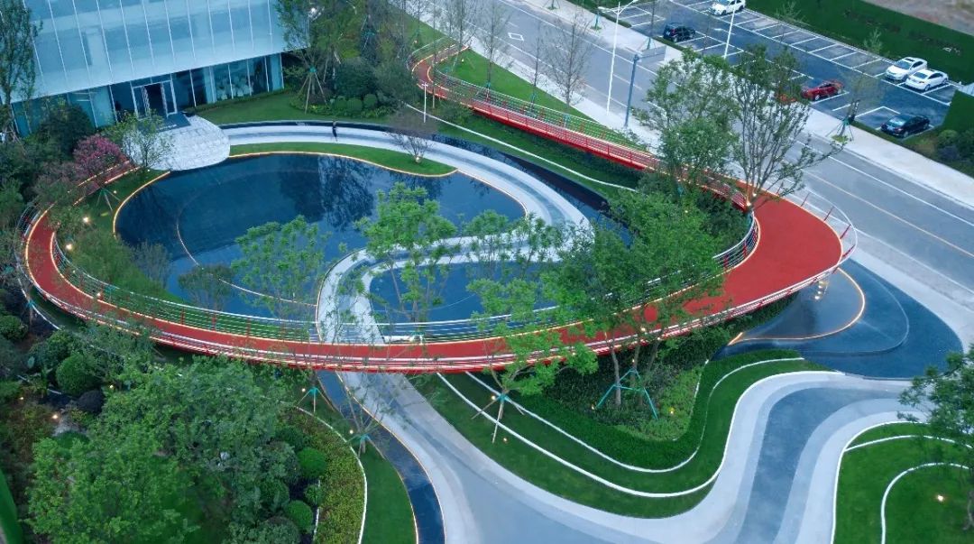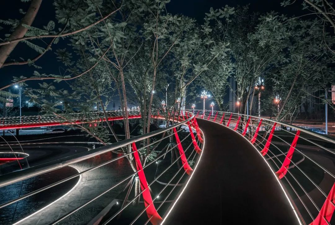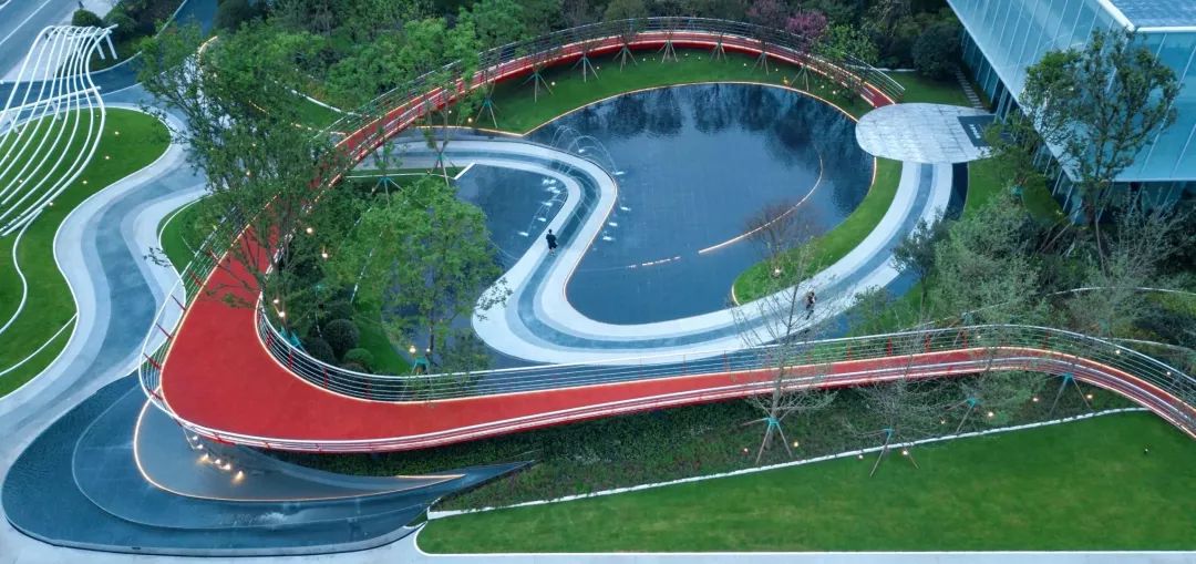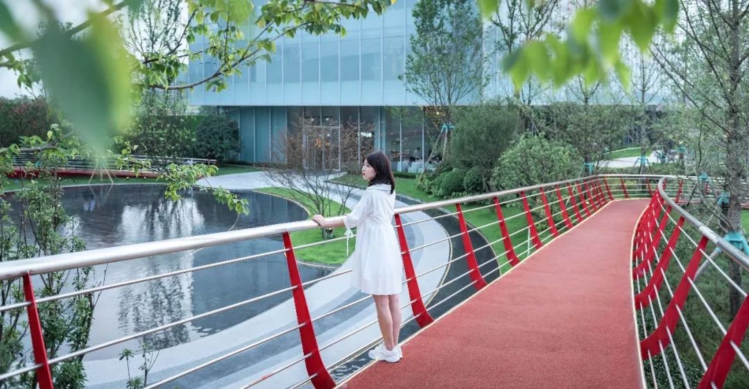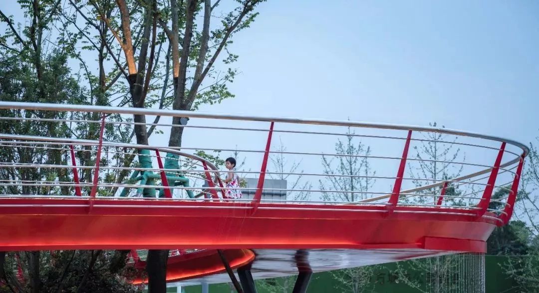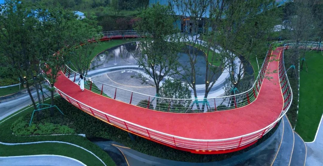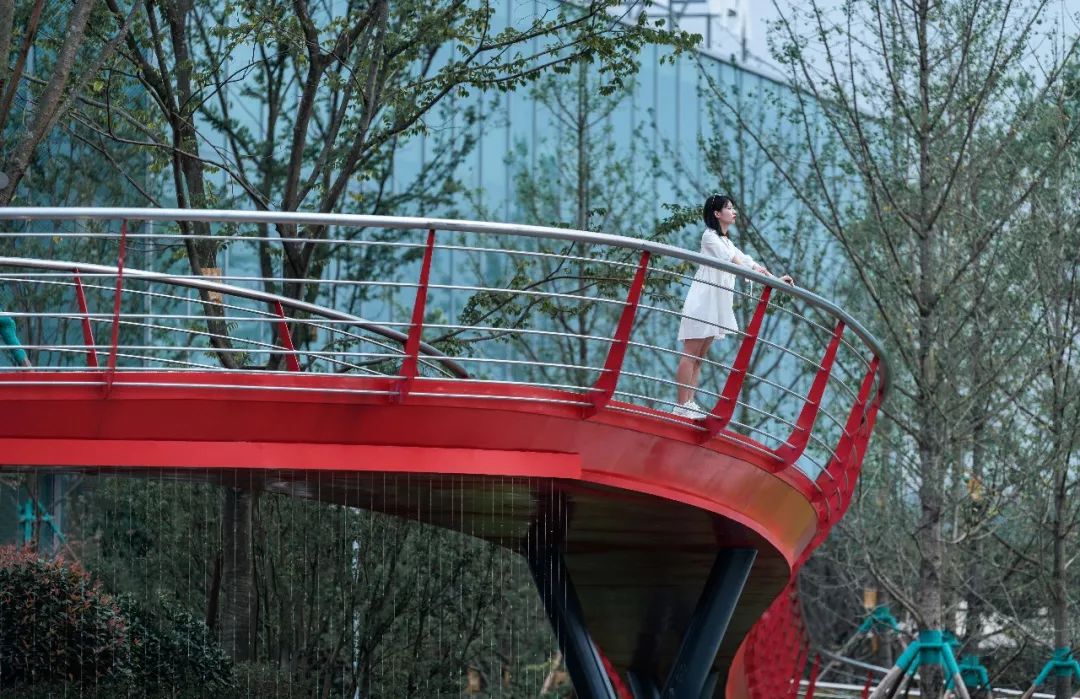 设计团队以颠覆传统的示范区形式,提取出“虹桥”景观元素,以具有张力的曲线描绘未来公园生活场景。架设活力的“虹桥”,营造立体景观空间,一条120米长的空中景观带,在场地上形成高低错落的空间,时而卧于水面,时而穿行林中,在感官上带给我们无限的想象力和思考。