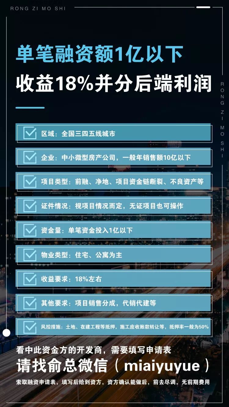一手资金方推荐|寻百强房企江浙沪及一二线省会城市住宅项目,可做前融及开发贷/国企资金寻华东及华中三线以上城市在建工程抵押融资项目/实力开发商寻全国住宅项目合作,可出资拿地及文旅康养教育勾地项目/实力自有资金可为百强地产、中小房企配资拿地/实力资方寻强二线城需前融住宅项目 须接受代建、代销,至少有土地成交确认书/上市品牌房企自有资金可融资代建为其他房企提供资金服务/实力资方提供中小房企救助基金 寻需融资项目/实力资方寻江西境内需拿地配资项目