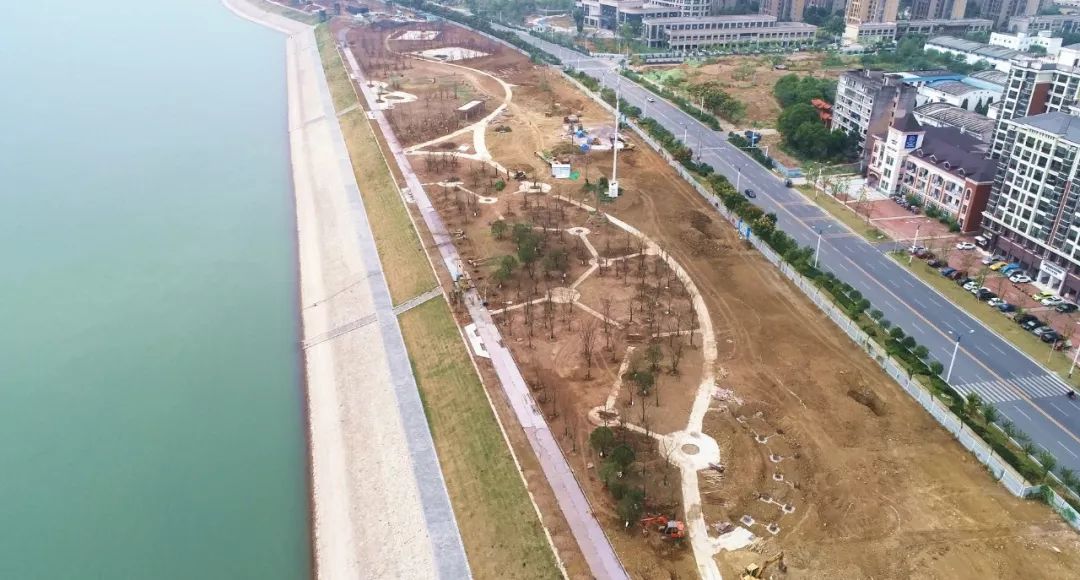 整个生态廊道修复工程以长江为“轴”,全长约9公里,东起金山大道西至董市老正街下街。眼下正在建设的是一期工程,从东干渠大道至南岗路。公园建设从土方施工到园林景观布置都遵循“生态优先、绿色发展”理念,整体布局沿江堤蜿蜒排开,依水就势,放眼望去与周边环境和谐共生,相得益彰。