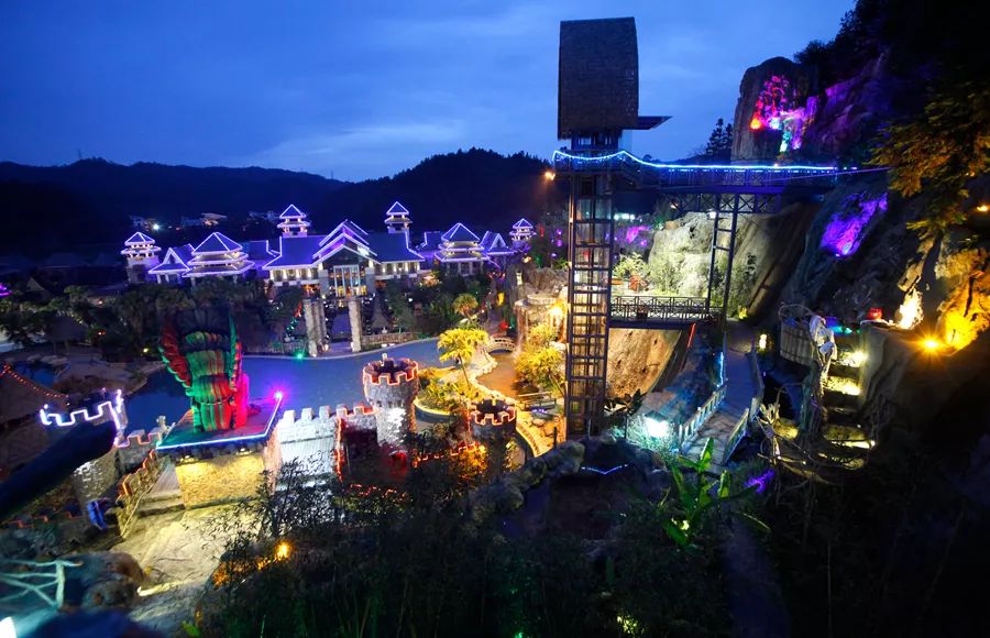 溶洞温泉区主要分布于温泉主题公园内的丘陵上,以清流温泉国家级地质公园内典型的喀斯特溶洞——九龙洞为蓝本建筑。