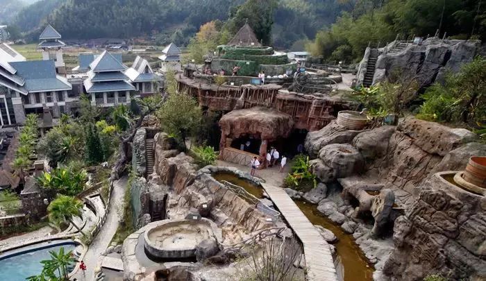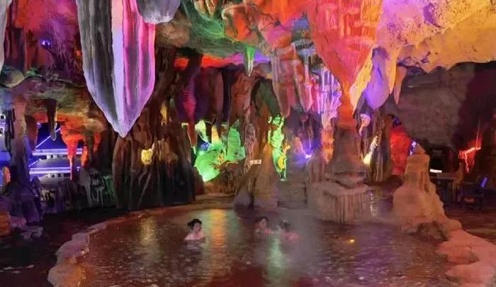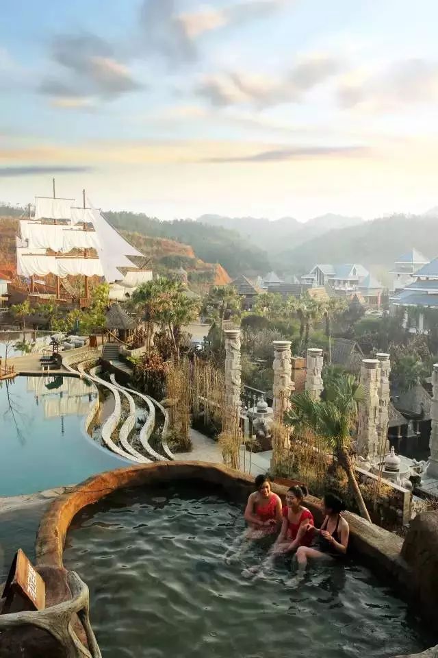 溶洞顶上随着溶洞顶部地势建有8个温泉泡池,其中包含三叠泉、瀑布泉、揽月泉、梦星泉、听溪泉、岩洞泉等各泉池,每个温泉池都在溶洞的边岩,居高临下、风景独好,且边上有瀑布群,在此沐浴别有一番韵味!