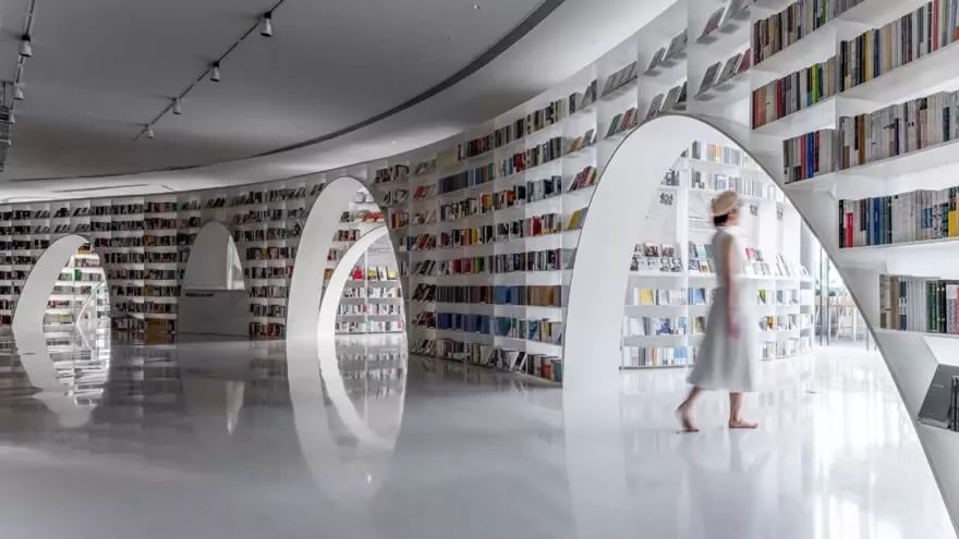 矩形或圆柱的书架穿插在各处,读者可以通过先进的AR导购,来定位和室内导航,最直观的找到想要的那本书。