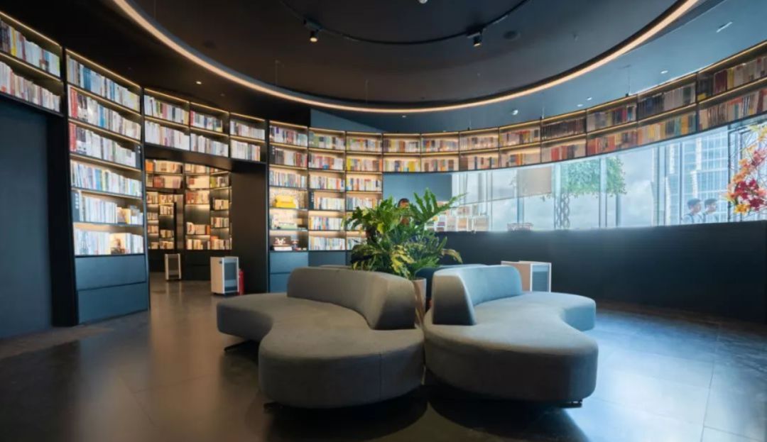 2号楼正对喻家湖,是最核心的文化主题书店,藏书量高达30万册,涵盖文学、社科、艺术、商业等多个品类。