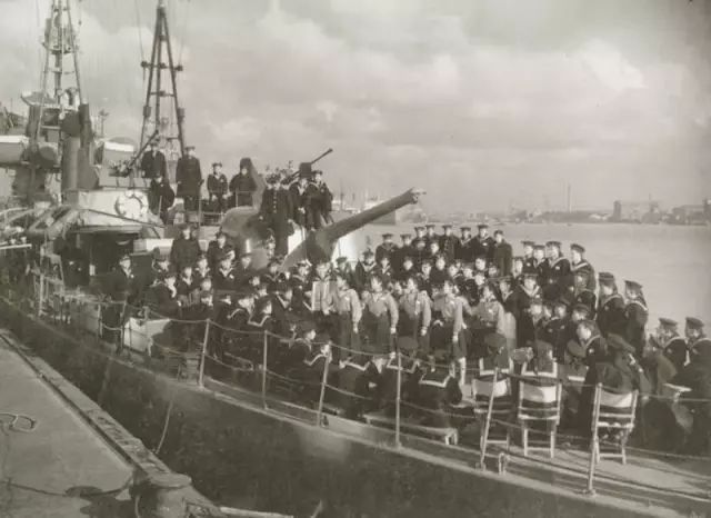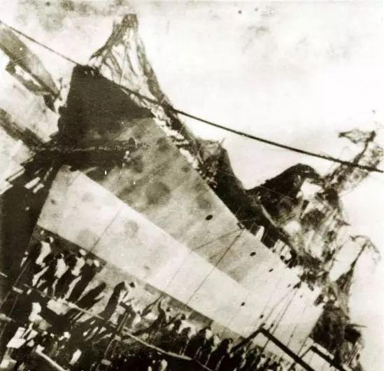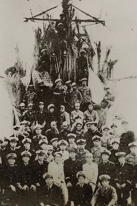 ▲黄安舰起义人员在舰上合影背景中的茅草是用来躲避空袭的伪装