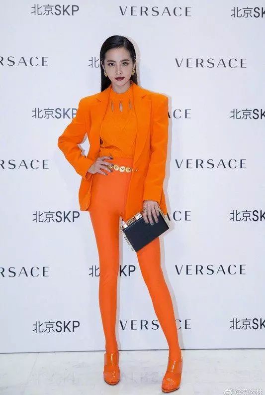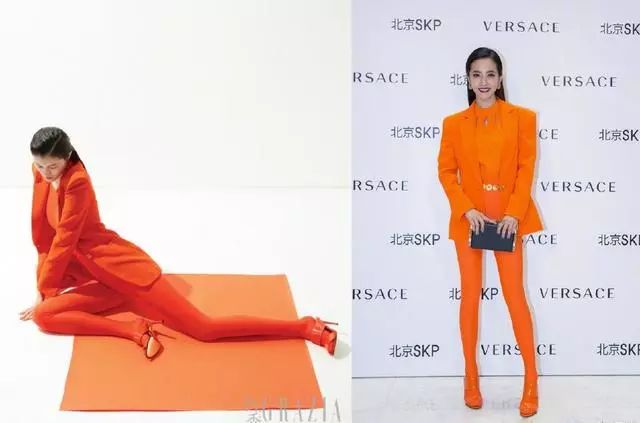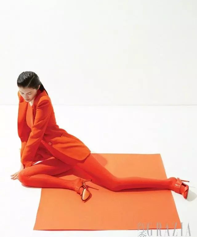 但是这身橘色造型,看了整体的搭配之后,感觉并不是很适合何穗的气质,可能主要是pose的问题,有点类似芭蕾舞的姿势,有点软绵绵的感觉,不够有力量,因而没有完全表达出这件衣服应该呈现出来的美感。何穗的腿毫无疑问是很长、很美,但是这个pose让人有一种特别别扭的感觉,让人觉得何穗的身高反而成了她最大的缺点。