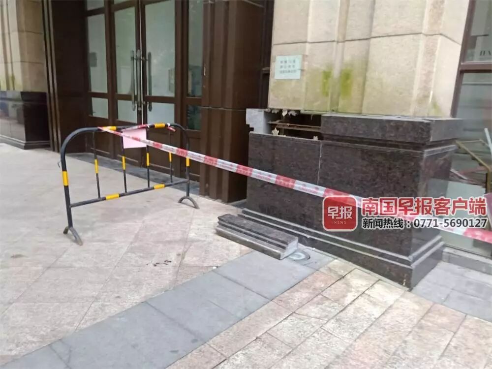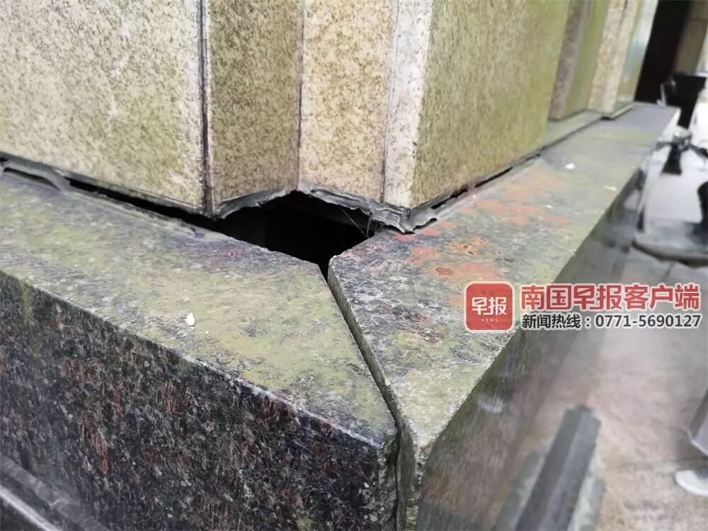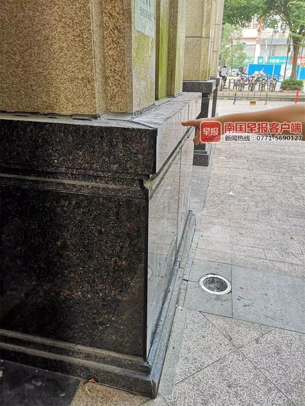 南国早报客户端记者在现场看到,涉事的大理石距离地面高约1米左右,掉落的部分已经被重新安装上去了,在接缝处涂了胶。