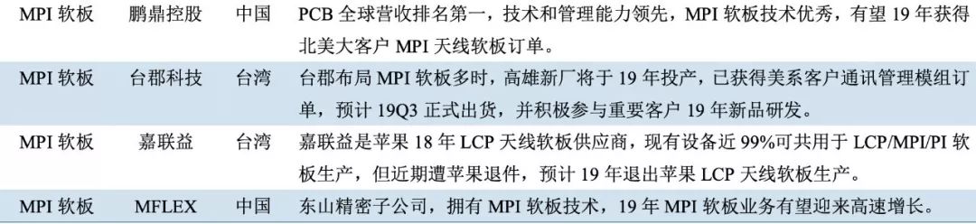 MPI 软板则由鹏鼎控股、MFLEX、台郡、嘉联益等占据。其中鹏鼎控股、嘉联益均为台虹主要客户,台郡专注于高频高速 MPI 软板天线设计,嘉联益已正式推出 MPI 天线产品,且现有设备大部分可共用于 LCP/MPI/PI 天线软板生产。
