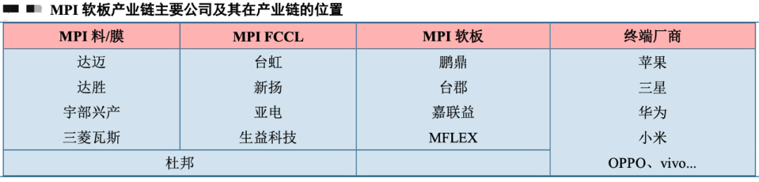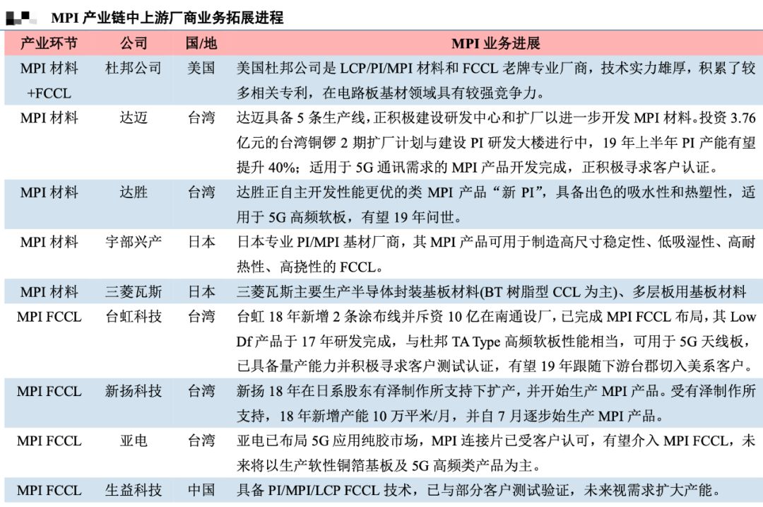 MPI 材料/膜方面,MPI 源于对原 PI 材料氟化物配方的改善,因此主要供应商为原 PI 材料商。