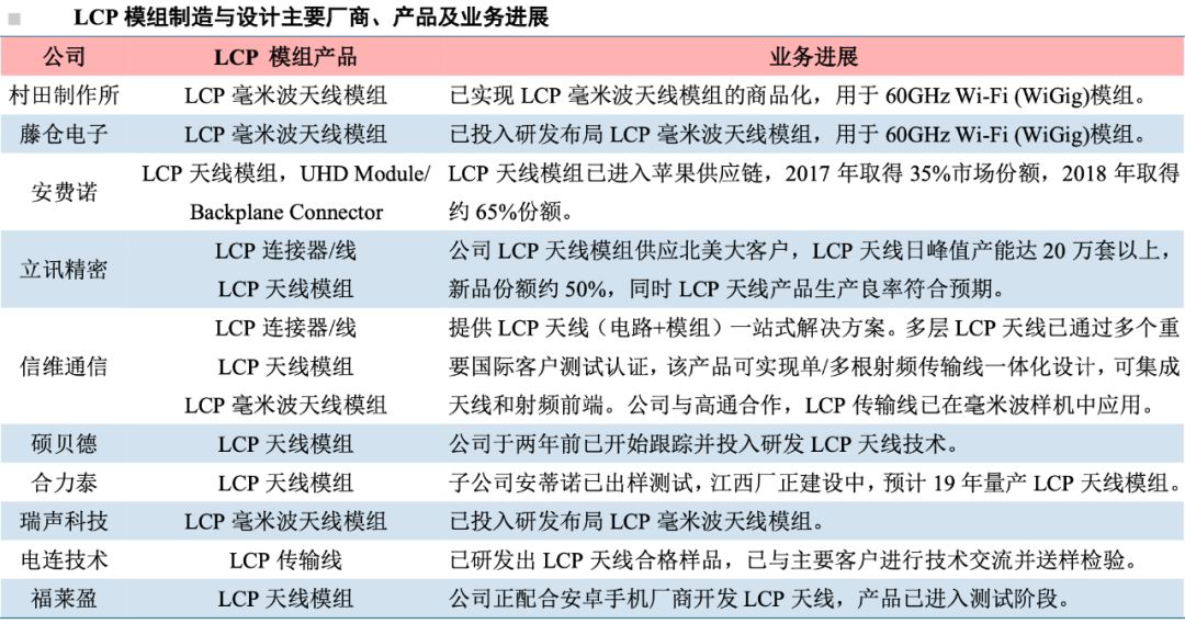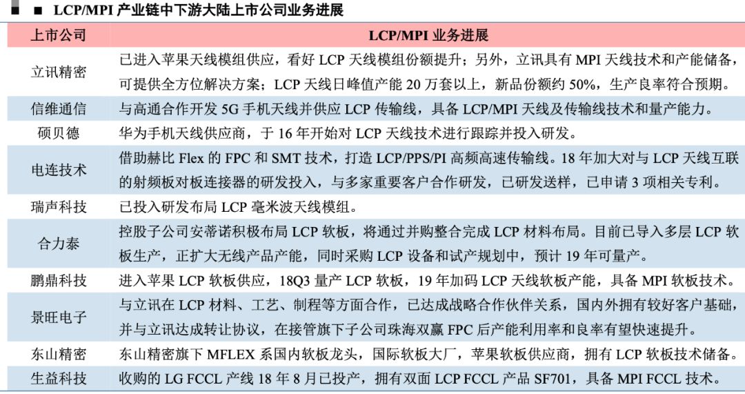 LCP天线模组则是国内厂商率先突破环节,立讯精密已成为苹果主力供应商。