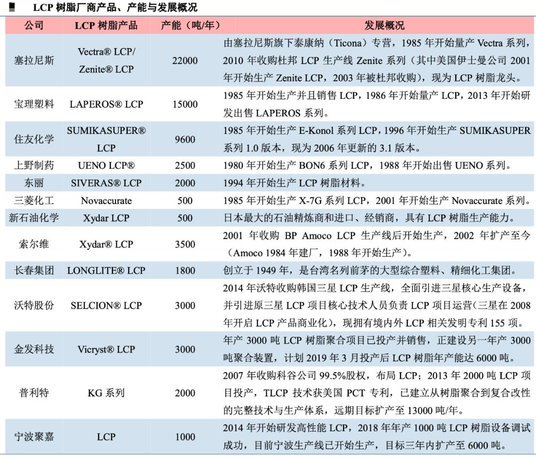 LCP 树脂材料龙头厂商宝理塑料、住友 化学、塞拉尼斯等在 1985 年“LCP 元年”已开始研发并商业化生产 LCP。