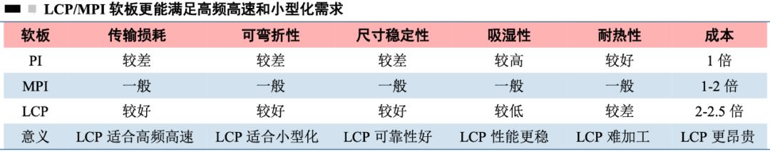 对于 15GHz 以下的 1-4 层简单软板应用,MPI 与 LCP 性能相当,能满足 Sub-6GHz 要求;并且 MPI 成本较 LCP 低 20%-30%,性价比突出。