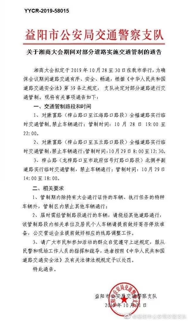 另外,为确保会议期间道路交通有序、安全、畅通, 益阳市公安局交通警察支队决定对部分道路进行交通管制。