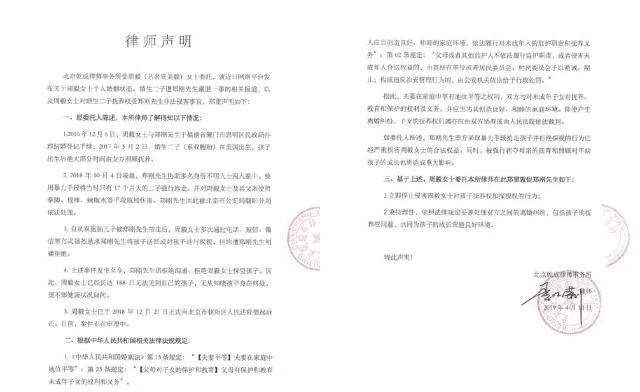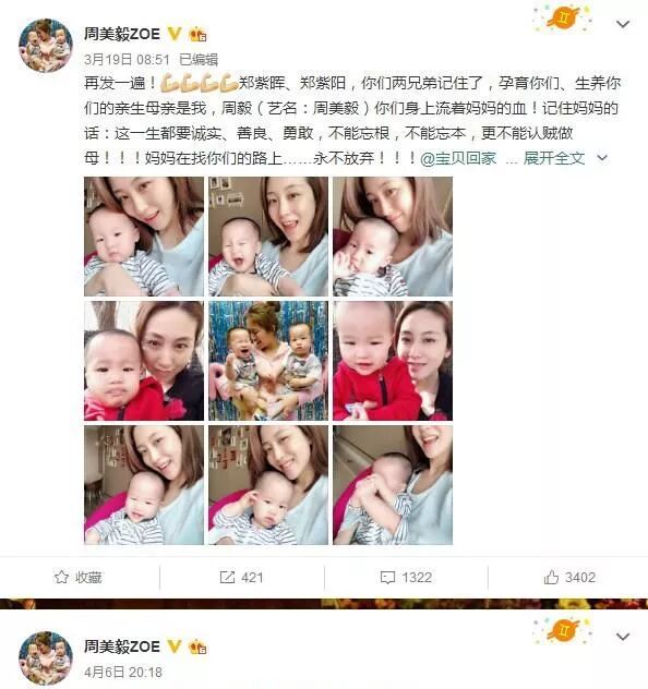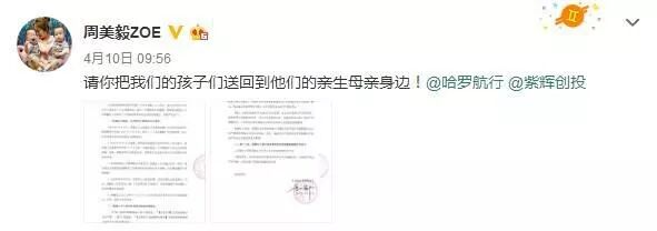4月10号的时候,周美毅更是发了律师声明,“请你把我们的孩子们送回到他们的亲生母亲身边!”点名郑刚,为此杨洋、李沁等人还声援她,引起了争议。
