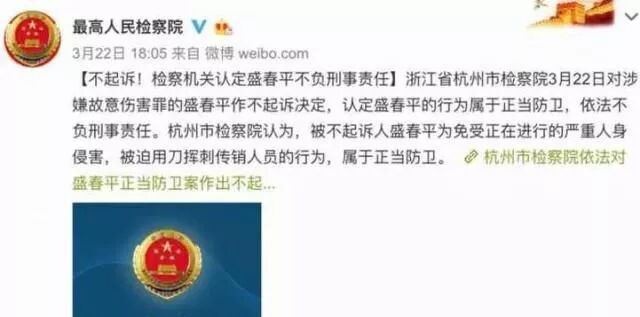 3月22日浙江省杭州市检察院对涉嫌故意伤害罪的盛春平作出不起诉决定,认定盛春平的行为属于正当防卫,依法不负刑事责任。检方认定被不起诉人盛春平案发时身处封闭的空间,人身自由和安全正在遭受众多不法传销人员侵害。