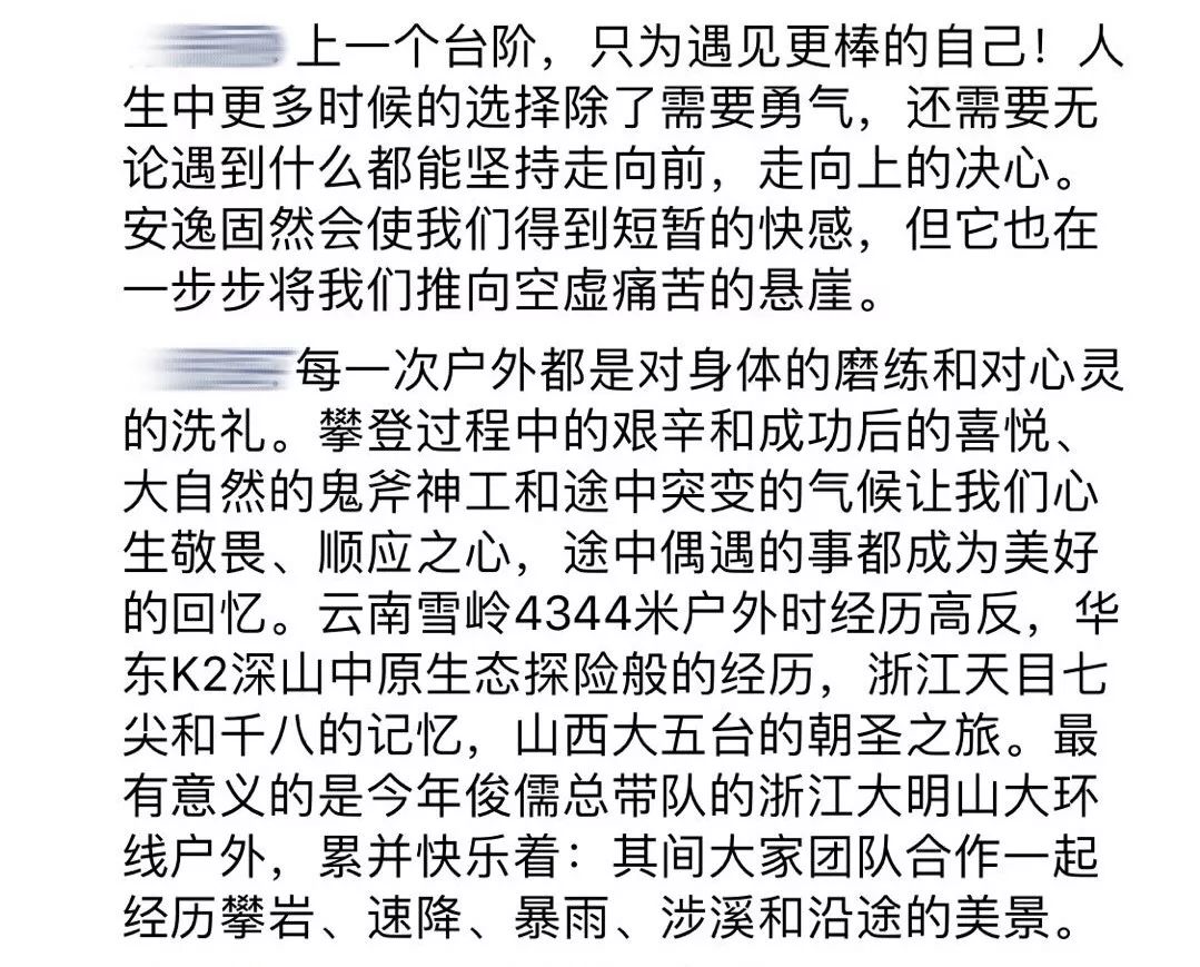 “登山的过程是不断向上的过程,每次冲破自己的生理极限,跨越新的高度,都是一次新的蜕变,一次灵魂的升华。”