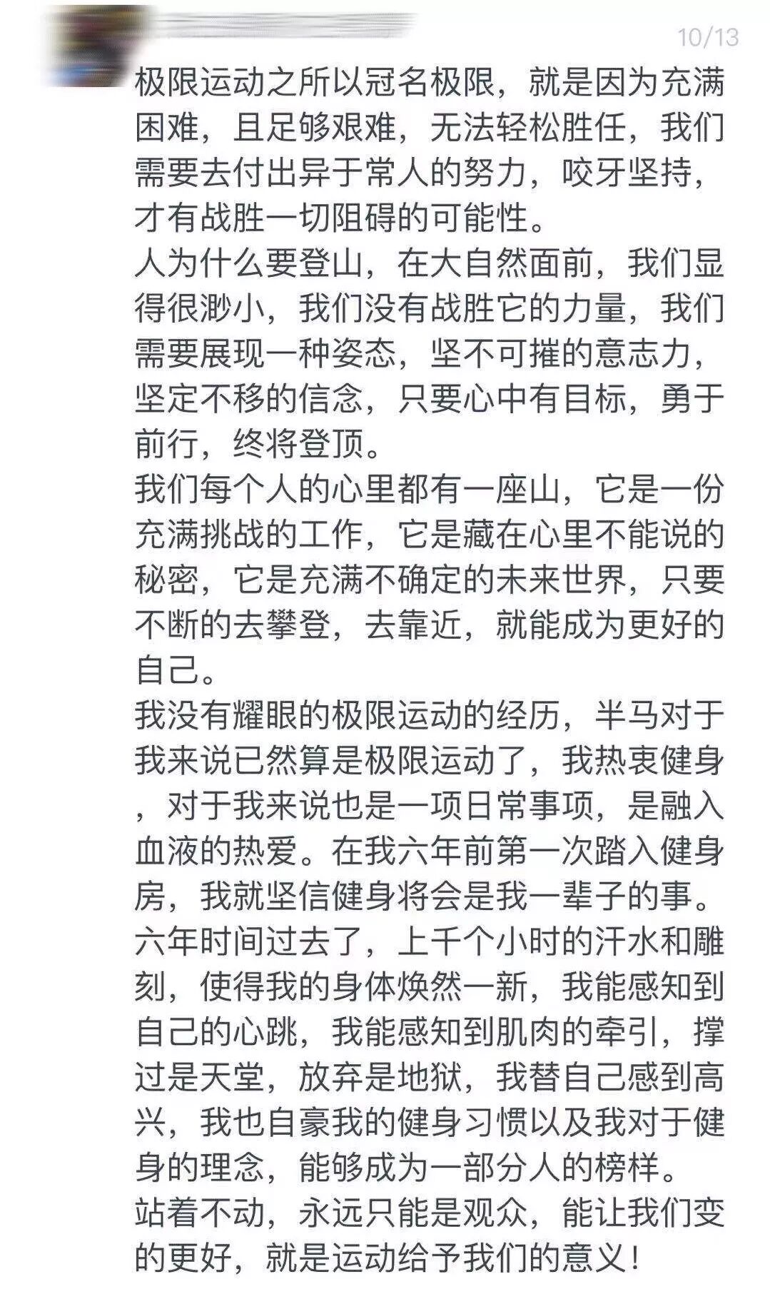 “我想,人生的道路只有去体验,才会明白其中的奥妙所在,才会感受到生命的真正意义。登山如此,跑步亦是如此。”
