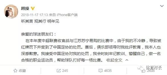 有意思的是,上次被罚之后,顾操曾在微博写到:“听其言 观其行 明年见。”并表示:“我接受中国足协对我的处罚,我会时刻牢记教训、警醒自己,做一名合格的职业运动员,帮助球队打好每一场比赛。”但如今不到一年的时间,顾操再次犯下大错,确实有些讽刺。