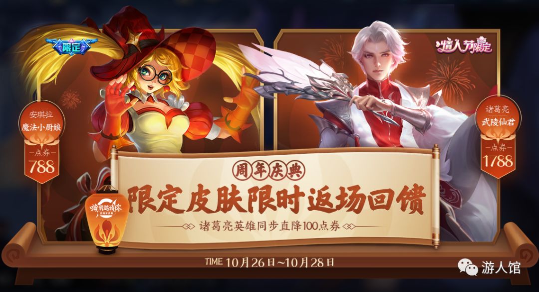 第7个福利就是限定皮肤的返场了,时间是26日到28日,安琪拉的魔法小厨娘售价788点券,诸葛亮的武陵仙君售价1788点券,并且这次返场后不会进入之后的周年投票池,可能是最后一次机会了。