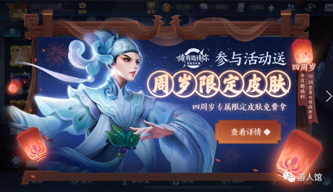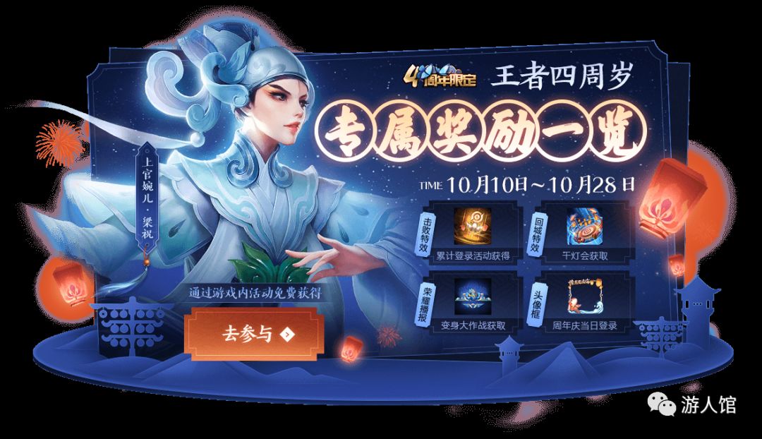 首先就是四周年的限定皮肤上官婉儿梁祝了,相关的活动已经开启,通过登录分享领取分享随机任务(一般都是参加对战)来获得碎片,一天最多6片,最快3天18块碎片搞定,不过凑齐了也要等10月26日的当天10点领取。