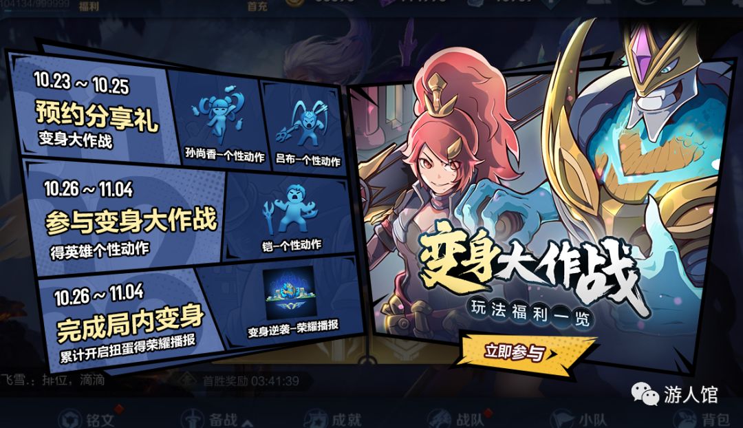 第5个福利是新玩法变身大作战在更新后也是开启测试和预约,只要收集记忆碎片就可以变身大小龙,并且在这个模式中,王者峡谷还会有夜间模式,千灯亮起的感觉真是太爽了。