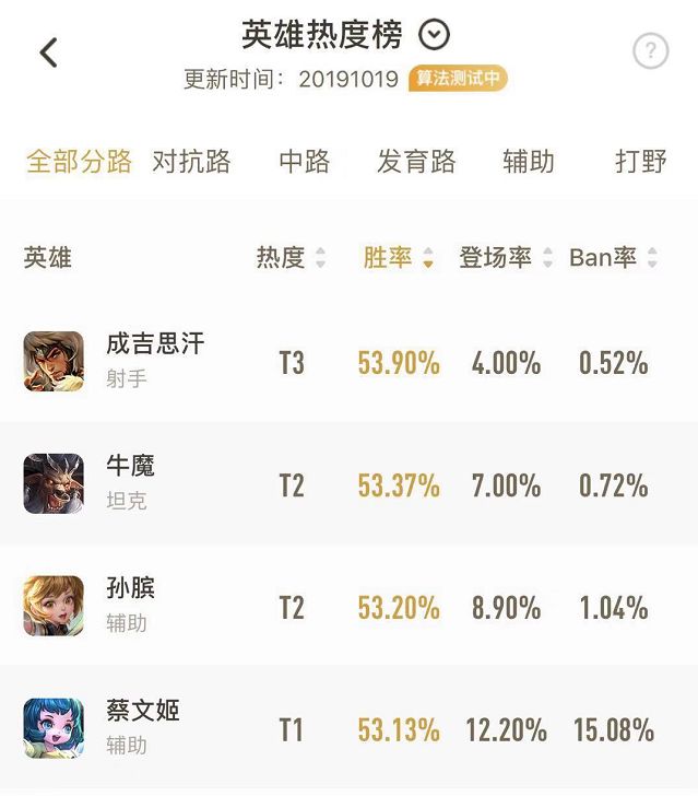 最后来说说现在胜率榜榜首成吉思汗,在前不久这个英雄增强过一次,导致其机动性大幅增加,而且该英雄的后期输出很高,刚好适应了S17赛季的发育路,导致成吉思汗的强势期前置,在中期便拥有了很夸张的伤害。
