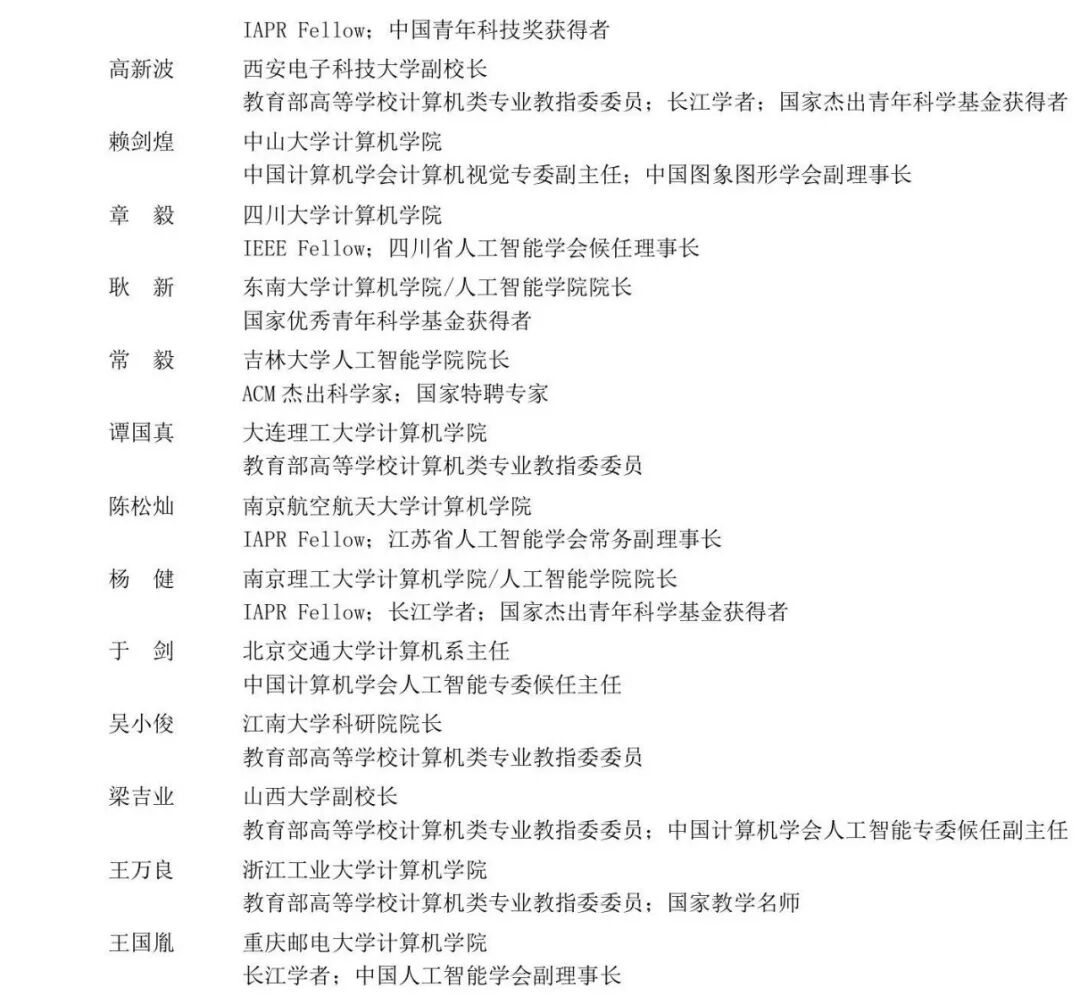 对我国人工智能领域有卓越贡献的两位中国计算机学会终身成就奖获得者张钹院士和陆汝钤院士,以及教育部高等学校计算机类专业教学指导委员会主任委员清华大学吴建平院士担任专家委员会顾问。