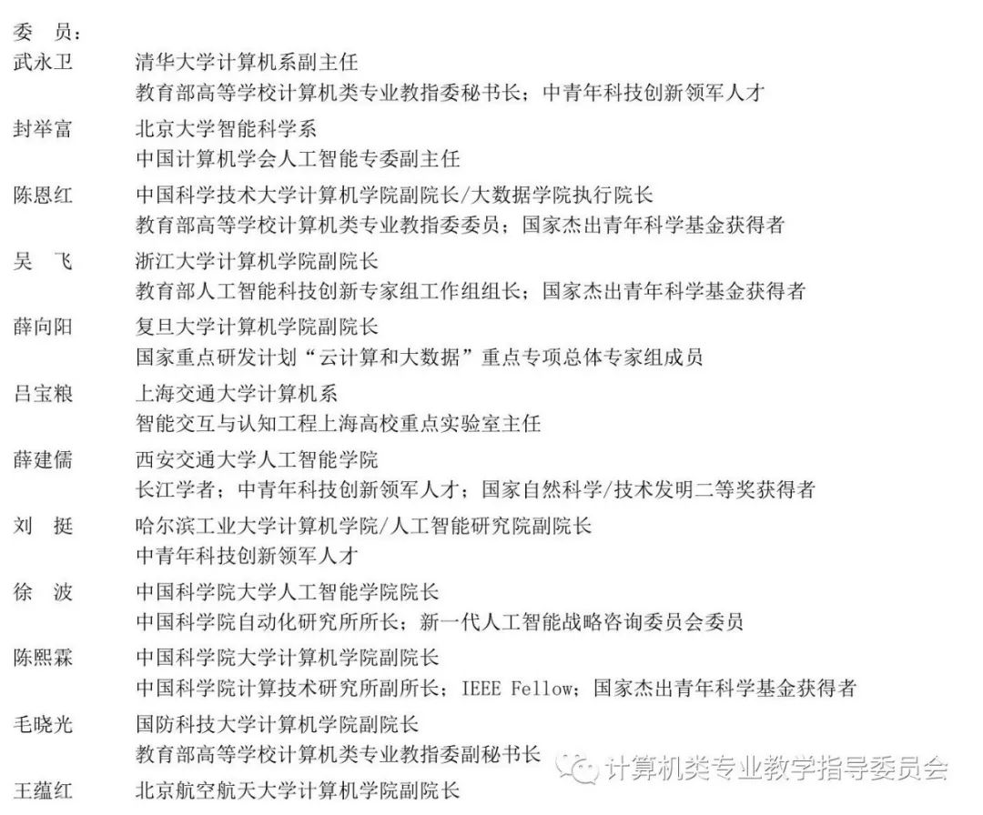 教育部高等学校计算机类专业教学指导委员会副主任委员、南京大学周志华教授任人工智能专家委员会主任;