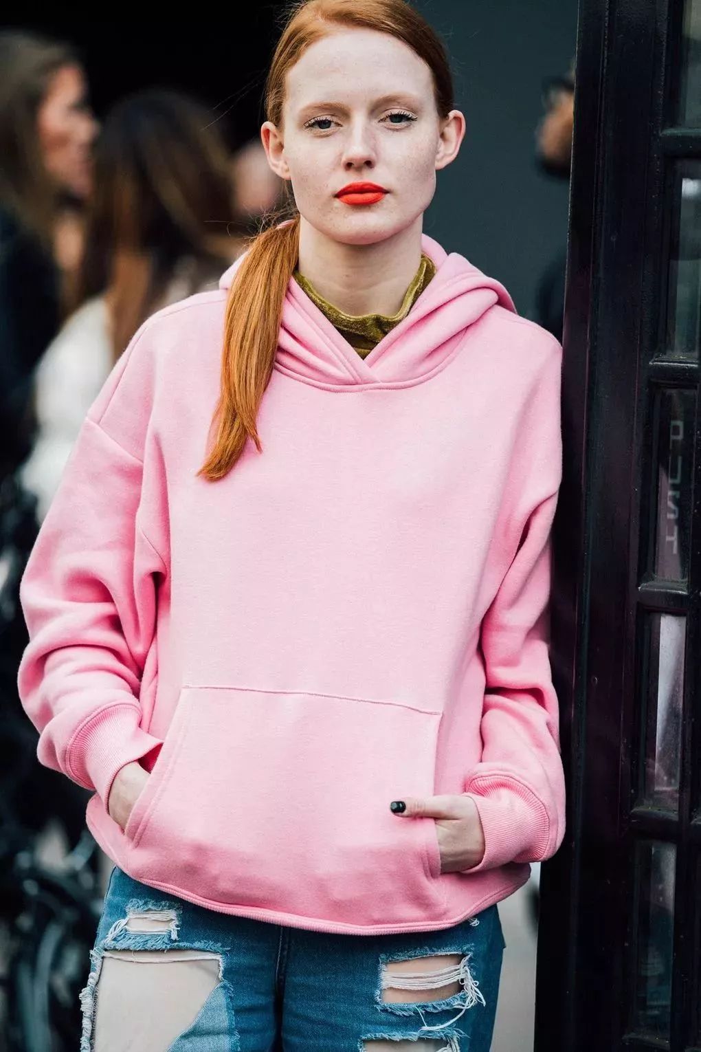 我们可以选择圆领款卫衣,将内搭的烟管领微微露出,时髦感简直了!