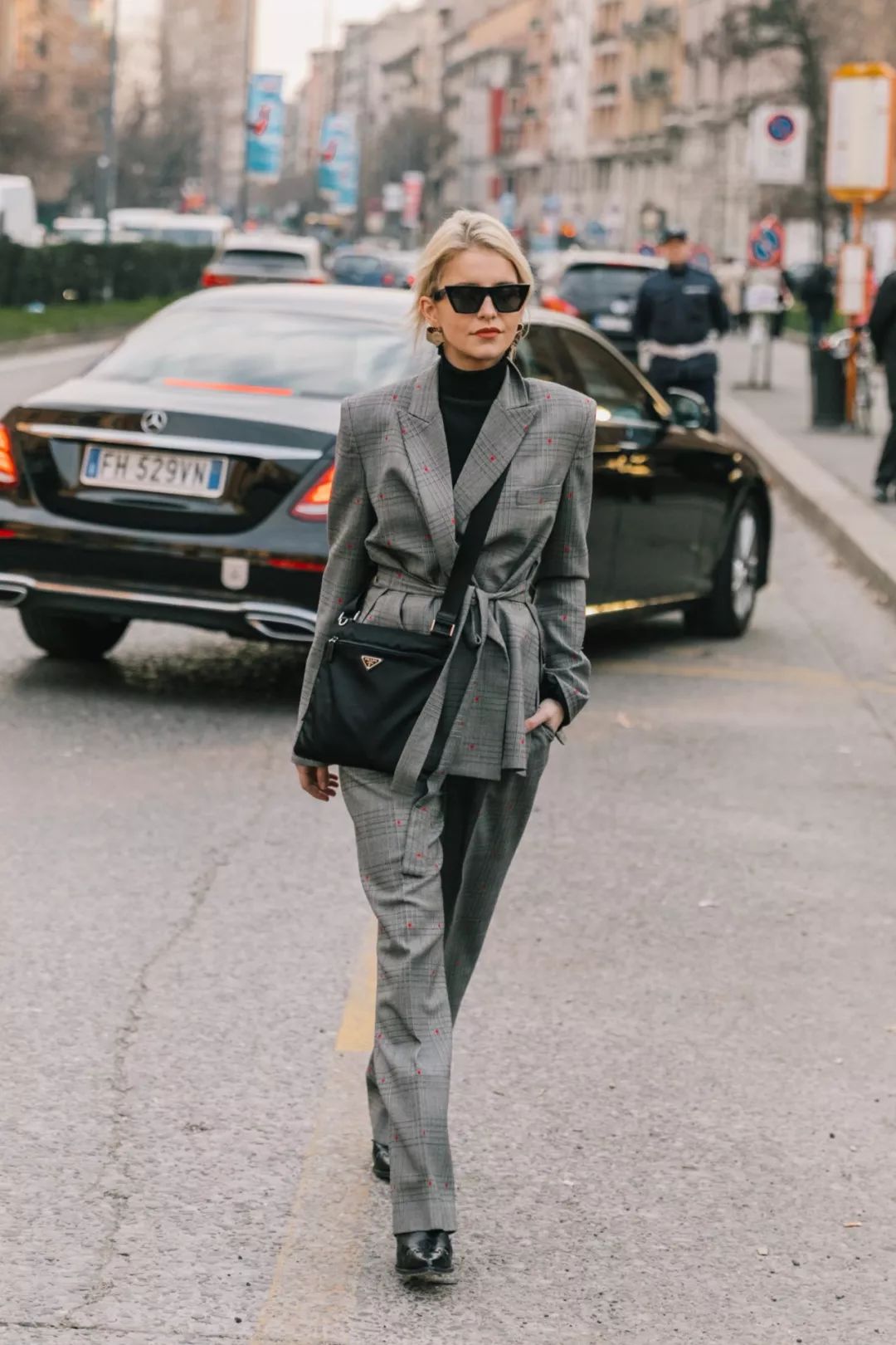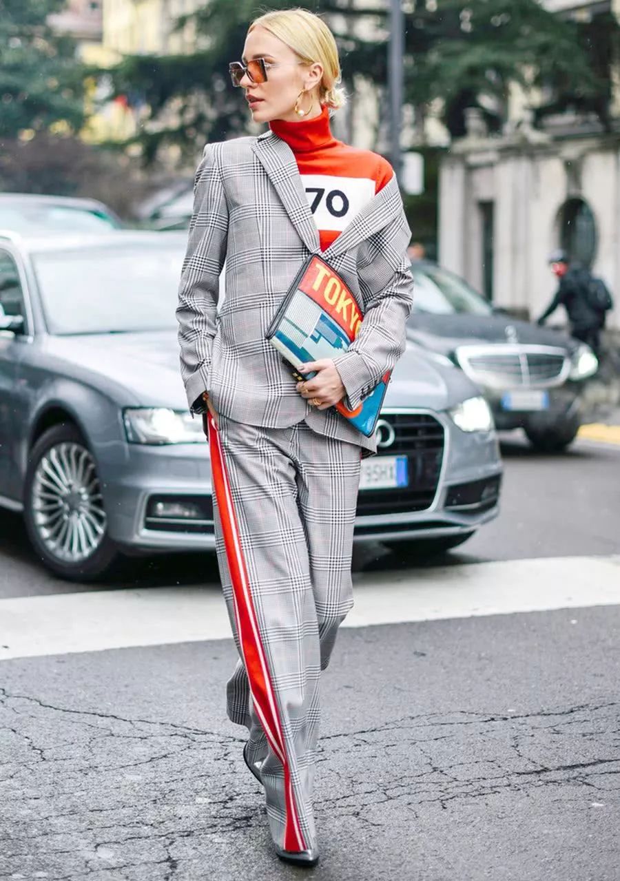 想要突出干练的职场范儿,那么一定要尝试格纹西装+黑色烟管领,两者的氛围相当专业!