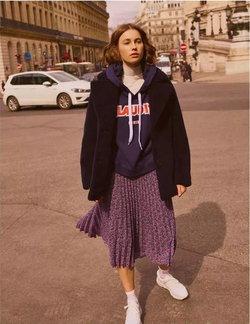 像百褶裙我就很推荐,它温和柔美,能够很好的融合卫衣的中性感,从而凹出时尚的“娘man”范儿!