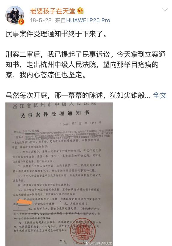 但是莫焕晶被判死刑后,林爸爸却放下了那份执念,和解了与绿城物业的官司。