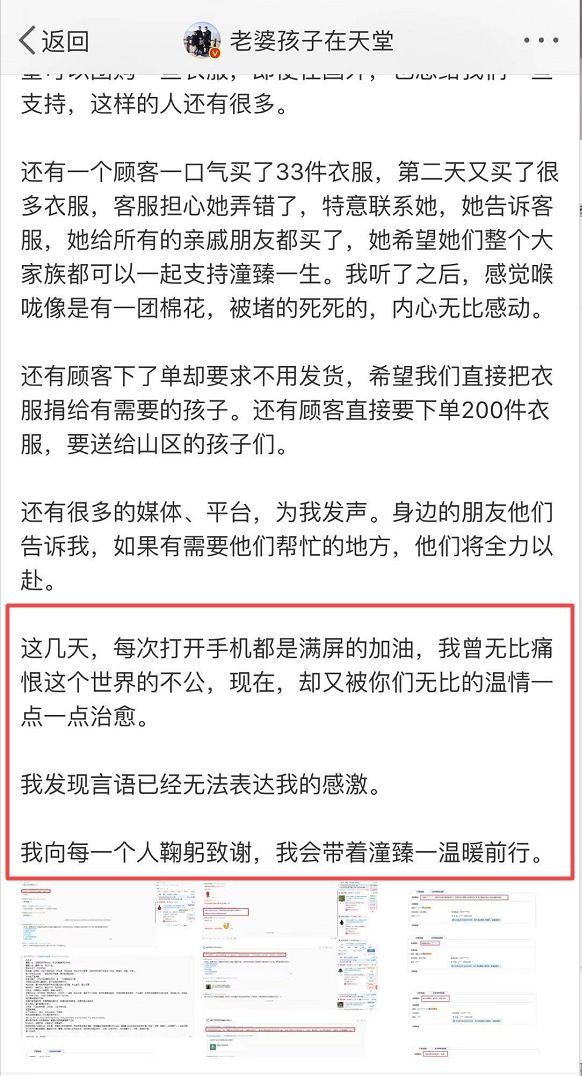 在他的微博和店铺里,你能感受到太多来自陌生人的温情和善良,有的妈妈,自己的孩子还小甚至还在肚子里,还坚持要下单;有人一口气买几十件衣服,连家里的亲戚都被拉来支持他的淘宝店;有人下了单却不发货,希望直接捐给山区……