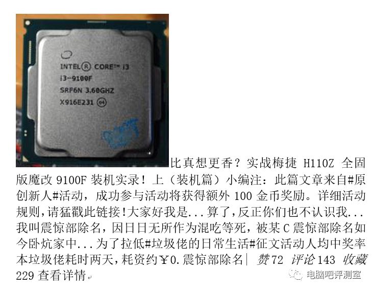 关于上期的魔改版BIOS因链接问题无法放出,需要的各位请移步我的新浪微博索取链接,主板也因为第二根内存条点不亮,8G内存捉襟见肘,只能重新物色新主板,配置方面我也会根据大家的建议进行适当的更改,同样,尽显卡所能(9100F无瓶颈的情况下),我会尽可能的从实战出发去多测试一些游戏,敬请期待!理论和专业评测请大家关注@翼王 @远古时代装BI猿 @茶茶121 @渐缜JZ @我家win8穿女装等大佬,他们有专业的设备专业的评测室,有更具专业性和权威性的数据供大家参照!其实最应该感谢的还是评论区的各位,真的很惊喜,首篇处女作收获了众多粉丝!是你们的建议给了动力,是你们的花样“喷”才能使我进步。