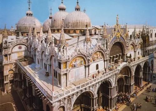 【圣马可大教堂】(外观):位于圣马可广场,与总督宫毗连的圣马可大教堂建于828年,因火灾在11世纪重建, 初只是用来安放圣马可的遗骸,其后用来收藏十字军东征时期从各国掠夺回来的宝物。它曾是中世纪欧洲 大的教堂,是威尼斯建筑艺术的经典之作,更是一座收藏丰富艺术品的宝库。