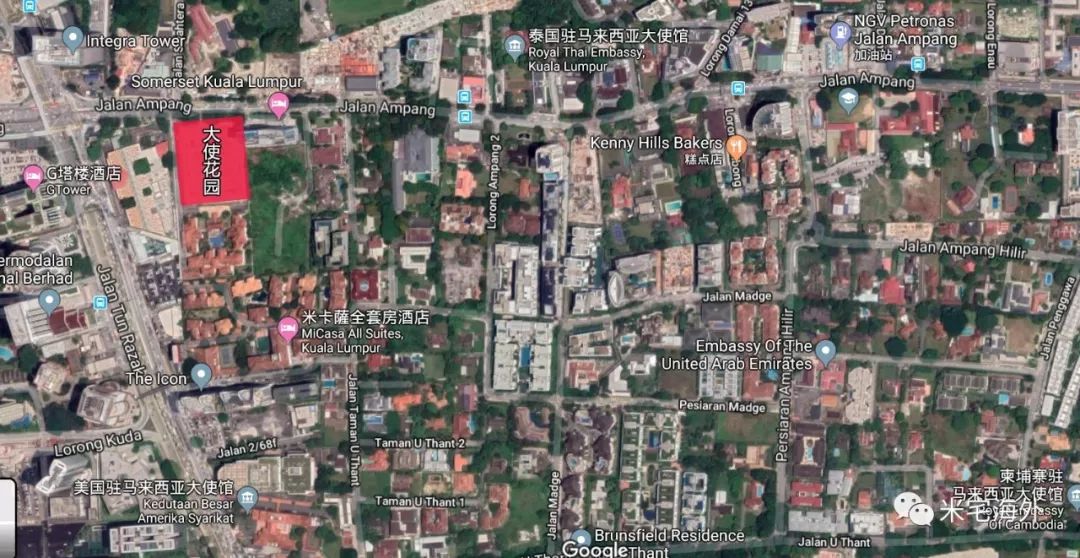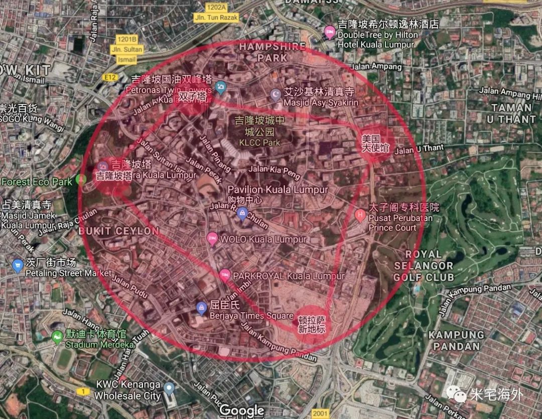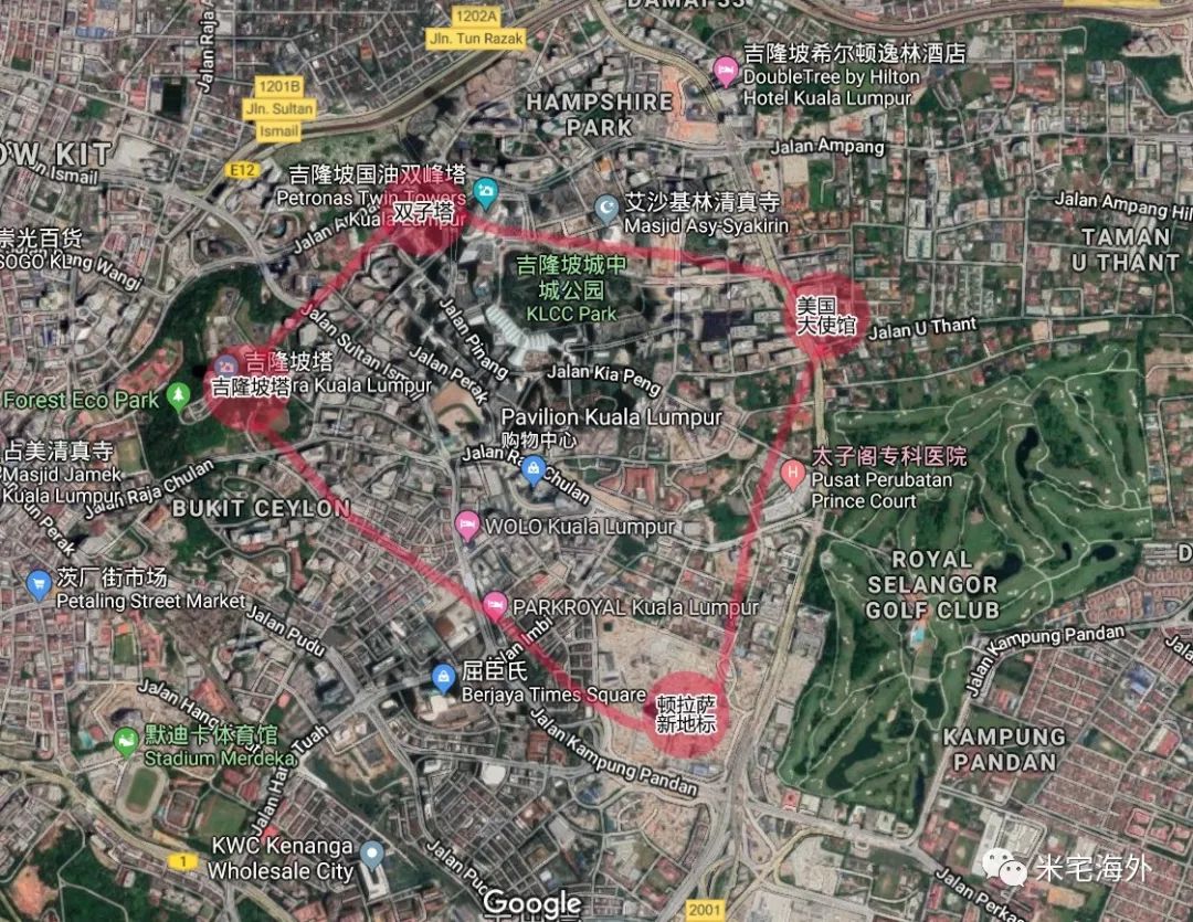 先在地图上把吉隆坡最重要的地标性建筑找出来,双子塔、敦拉萨塔、吉隆坡塔、美国大使馆,连起来。