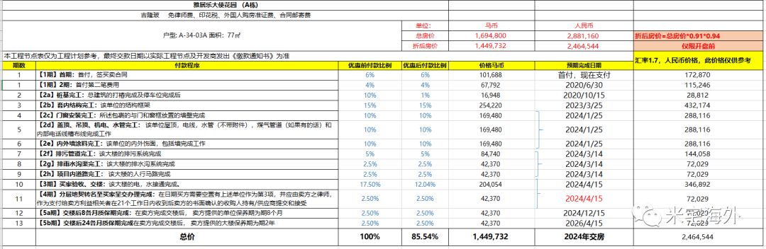 我果断选择都是带4的楼层、带4的户型,在2404和3404之间选择了一下,选择了3404,总价只贵了6万人民币。