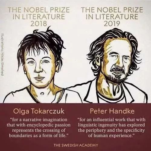 2018年和2019年诺贝尔文学奖的获得者分别是波兰作家奥尔加·托卡尔丘克(Olga Tokarczuk)和奥地利作家彼得·汉德克(Peter Handke)。