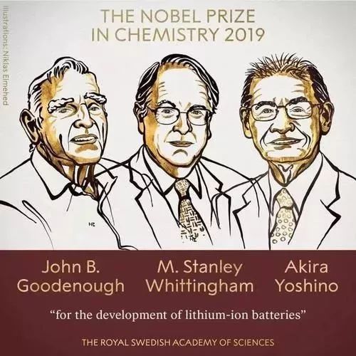 2019年诺贝尔化学奖授予的是美国得克萨斯大学奥斯汀分校机械工程和材料科学教授约翰·B·古迪纳夫、美国纽约州立大学宾厄姆顿大学特聘教授M·斯坦利·威廷汉和名古屋名城大学教授吉野彰,以表彰他们在锂离子电池研发领域作出的贡献。
