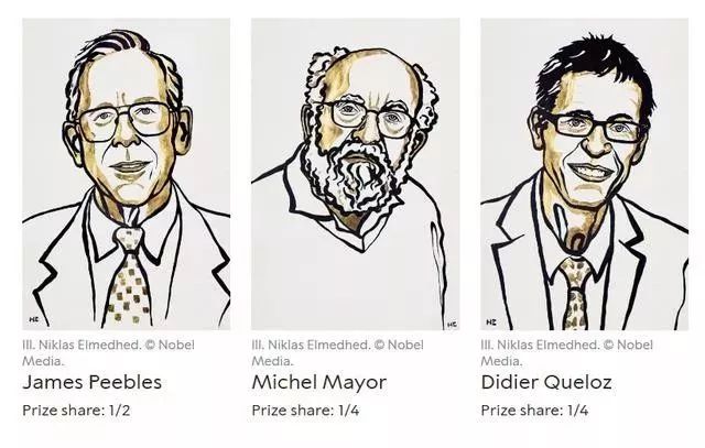 2019年诺贝尔物理学奖的获得者是美国物理学家吉姆·皮布尔斯(James Peebles)、来自瑞士的物理学家米歇尔·麦耶(Michel Mayor)以及天文学家迪迪埃·奎洛兹(Didier Queloz)。其中,皮布尔斯因物理宇宙学的理论研究获奖,独占一半奖金,而梅厄和奎洛兹则因为发现首个围绕类日恒星运行的系外行星而获奖,两人平分另外一半奖金。诺贝尔物理学奖的总奖金为900万瑞典克朗,折合成人民币大约649万。