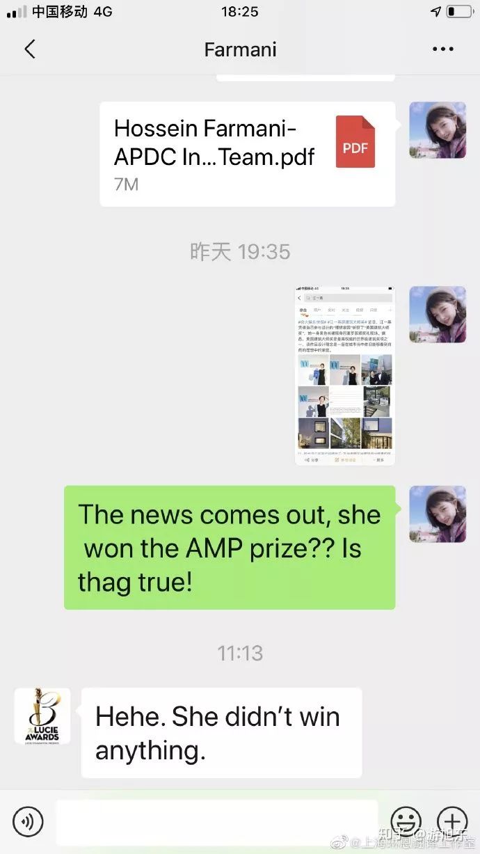 但是认证为上海谨译商务咨询有限公司企业官方微博的 @上海琳恩翻译工作室 晒出了他们和奖项创始人 Farmani 的聊天记录,Farmani 说他根本不认识江一燕,并且说「she didn't win anything」